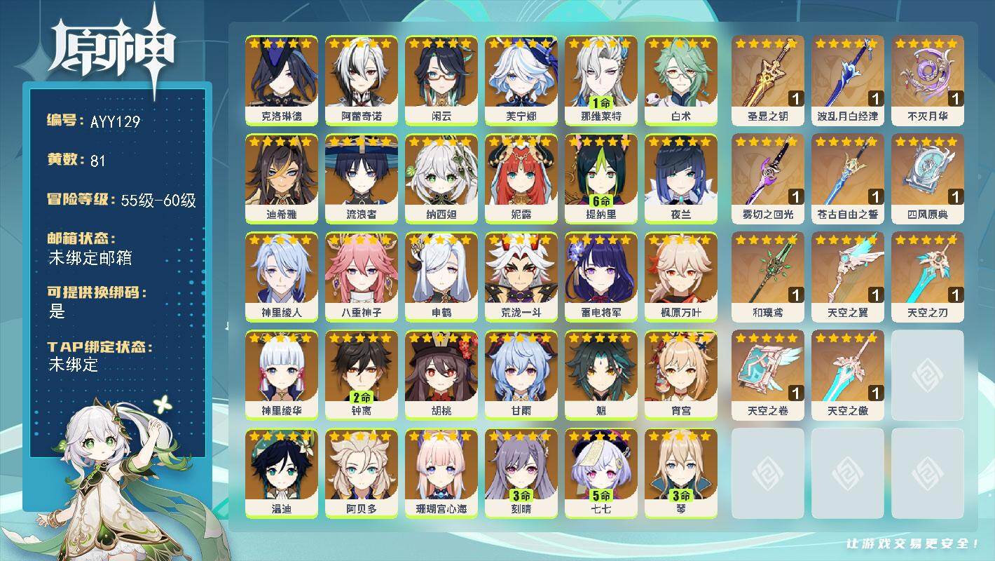 [15499210]60级/81黄/女主/40个五星角色/16个五星武器 0命克洛琳德,0命阿蕾奇诺,0命闲云,0命芙宁娜,1命那维莱特,0命白术,0命迪希雅,0命流浪者,0命纳西妲,0命妮露,满命提纳里,0命夜兰,0命神里绫人,0命八重神子,0命申鹤,0命荒泷一斗,0命雷电将军,0命枫原万叶,0命神里绫华,2命钟离,0命胡桃,0命甘雨,0命魈,0命宵宫,0命温迪,0命阿贝多,0命珊瑚宫心海,3命刻晴,5命七七,3命琴,2命莫娜,2命迪卢克,0命玛拉妮,0命艾梅莉埃,0命恰斯卡,0命玛薇卡,1命梦见月瑞希,0命丝柯克,0命菈乌玛,0命杜林,精1圣显之钥,精1波乱月白经津,精1不灭月华,精1雾切之回光,精1苍古自由之誓,精1四风原典,精1和璞鸢,精1天空之翼,精1天空之刃,精1天空之卷,精1天空之傲