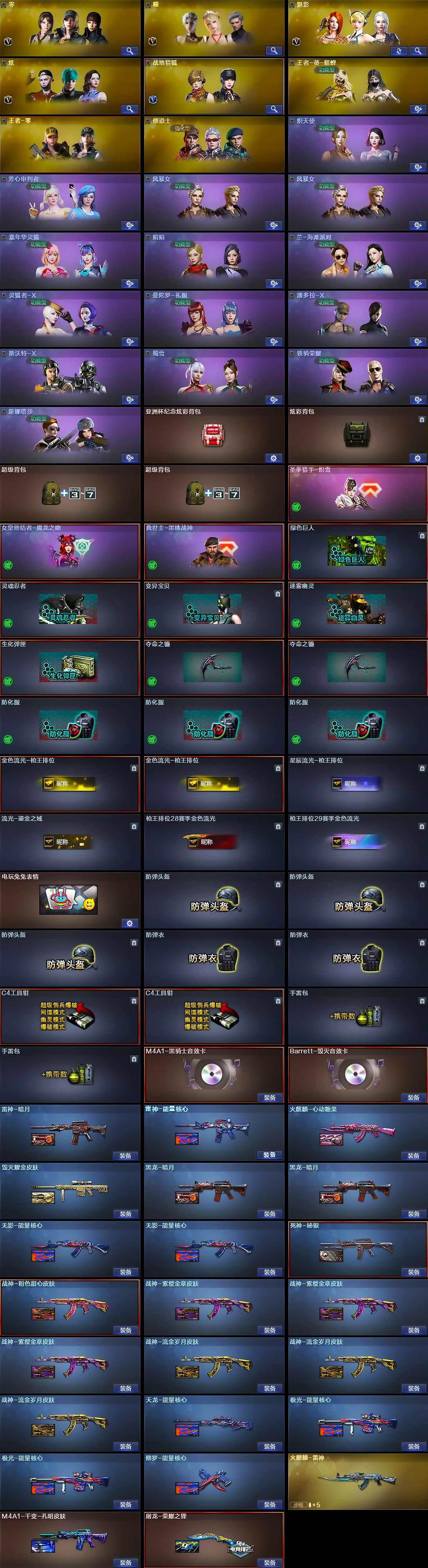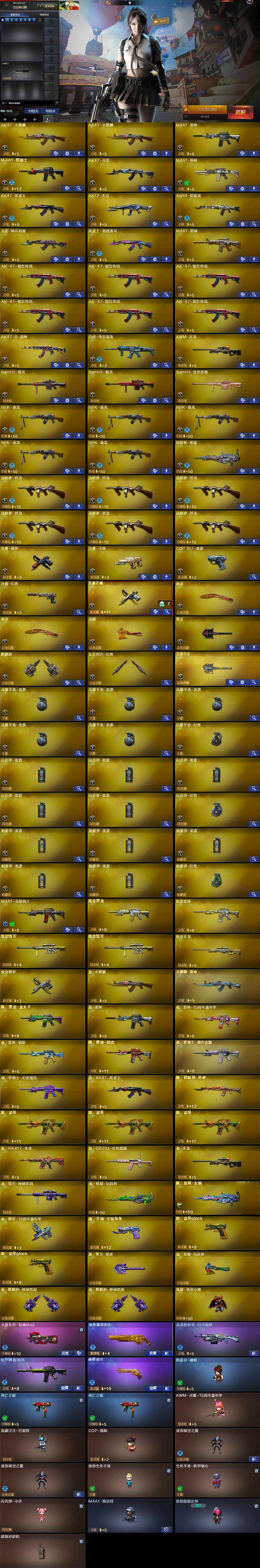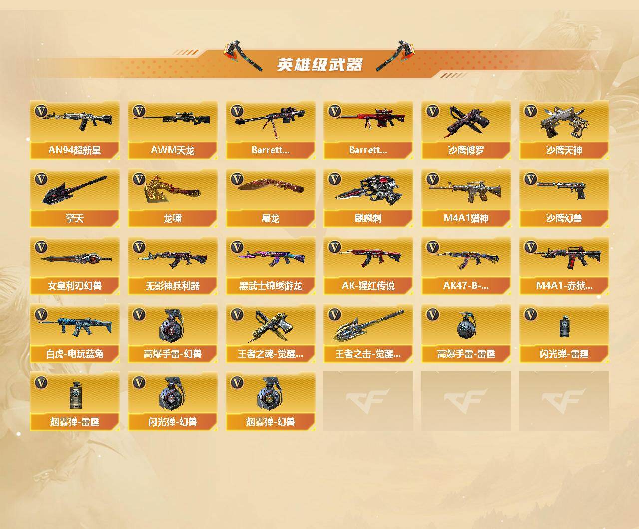 【英雄级武器】:AK47-火麒麟*2,M4A1-雷神,M4A1-黑骑士,AK47-无影,M4A1-死神,AK47-黑武士,AK12-天启,AN94-超新星,无影-神兵利器,黑武士-锦绣游龙,M4A1-猎神,AK-47-猩红传说*6,AK47-B-战神,白虎-电玩蓝兔,AWM-天龙,Barrett-毁灭,Barrett-极光,Barrett-金色蔷薇,RPK-盘龙*5,加特林-炼狱,汤姆逊-烈龙*6,沙鹰-修罗,沙鹰-天神,COP-雷霆,沙鹰-幻兽,王者之魂-觉醒版,屠龙*2,龙啸,擎天,麒麟刺,女皇利刃-幻兽,王者之击-觉醒版,高爆手雷-雷霆*5,高爆手雷-幻兽,闪光弹-雷霆*5,闪光弹-幻兽,烟雾弹-雷霆*5,烟雾弹-幻兽,M4A1-赤狱骑士