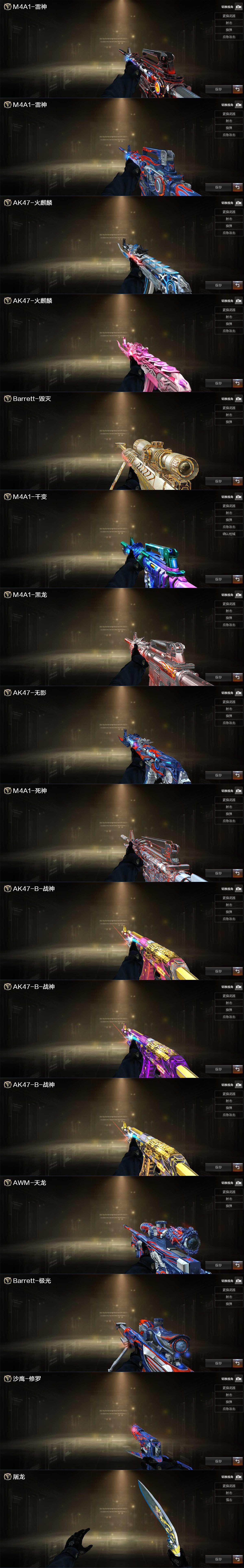 【皮肤】:雷神-暗月,雷神-能量核心,火麒麟-雷神,火麒麟-心动糖果,毁灭耀金皮肤,M4A1-千变-孔明皮肤,黑龙-暗月*2,无影-能量核心*2,死神-秘银,战神-粉色甜心皮肤,战神-紫绶金章皮肤*3,战神-流金岁月皮肤*3,AK47-B-常胜将军-孙权,天龙-能量核心,极光-能量核心*2,修罗-能量核心,屠龙-荣耀之锋