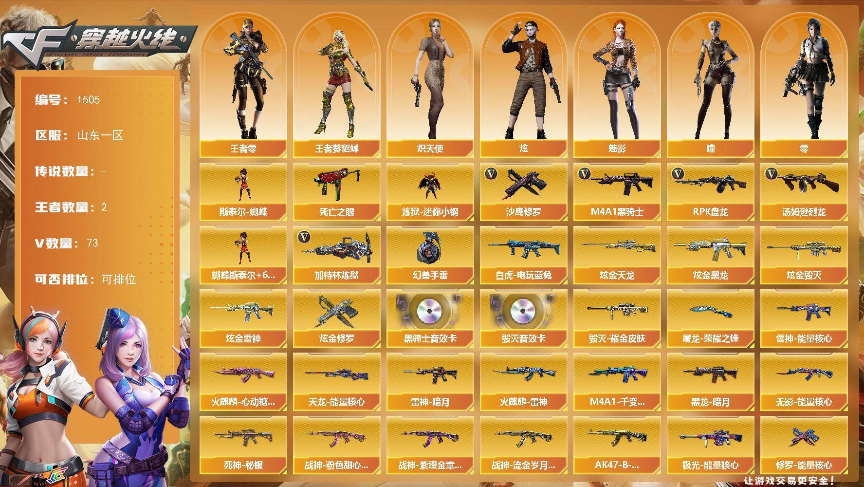 [15499535]山东一区-73V-2王者-6炫金 【热门武器】:死亡之眼*2,白虎-电玩蓝兔,炼狱-迷你小钢,M4A1-黑骑士,汤姆逊-烈龙*6,RPK-盘龙*5,加特林-炼狱,斯泰尔-蝴蝶,沙鹰-修罗,高爆手雷-幻兽 【王者炫金武器】:炫金黑龙,炫金雷神,炫金毁灭*2,炫金天龙,炫金修罗 【音效卡】:M4A1-黑骑士音效卡,Barrett-毁灭音效卡 【皮肤】:雷神-暗月,雷神-能量核心,火麒麟-雷神,火麒麟-心动糖果,毁灭耀金皮肤,M4A1-千变-孔明皮肤,黑龙-暗月*2,无影-能量核心*2,死神-秘银,战神-粉色甜心皮肤,战神-紫绶金章皮肤*3,战神-流金岁月皮肤*3,AK47-B-常胜将军-孙权,天龙-能量核心,极光-能量核心*2,修罗-能量核心,屠龙-荣耀之锋 【角色】:零,瞳,魅影,炫,战地猎狐,王者-葵-貂蝉,王者-零,修道士,炽天使,芳心审判者,风暴女*2,嘉年华灵狐,娟娟,兰-海滩派对,灵狐者-X,曼陀罗-礼服,潘多拉-X,斯沃特-X,蜀雪,铁骑荣耀,新娜塔莎 【人偶武器】:炼狱-迷你小钢,斯泰尔-蝴蝶,AWM-灵狐-15周年嘉年华,海滩汪汪-巴雷特,COP-旗袍,迷你裂空之翼*2,迷你生化手雷,生化手雷-机甲核心,闪光弹-小乔,M4A1-斯沃特,迷你超能女侍 【暴走生化】:死亡之眼*2,超级对讲机 【挑战大师】:火狱乱世-超越Max,神圣爆裂者III,冰龙粉碎者-白马银枪,机甲撕裂者III,阐释者III,VEPR-12-紫魔 【英雄级武器】:AK47-火麒麟*2,M4A1-雷神,M4A1-黑骑士,AK47-无影,M4A1-死神,AK47-黑武士,AK12-天启,AN94-超新星,无影-神兵利器,黑武士-锦绣游龙,M4A1-猎神,AK-47-猩红传说*6,AK47-B-战神,白虎-电玩蓝兔,AWM-天龙,Barrett-毁灭,Barrett-极光,Barrett-金色蔷薇,RPK-盘龙*5,加特林-炼狱,汤姆逊-烈龙*6,沙鹰-修罗,沙鹰-天神,COP-雷霆,沙鹰-幻兽,王者之魂-觉醒版,屠龙*2,龙啸,擎天,麒麟刺,女皇利刃-幻兽,王者之击-觉醒版,高爆手雷-雷霆*5,高爆手雷-幻兽,闪光弹-雷霆*5,闪光弹-幻兽,烟雾弹-雷霆*5,烟雾弹-幻兽,M4A1-赤狱骑士 【道具】:亚洲杯纪念炫彩背包,炫彩背包,超级背包*2,圣拳猎手-炽雪,女皇终结者-魔龙之吻,救