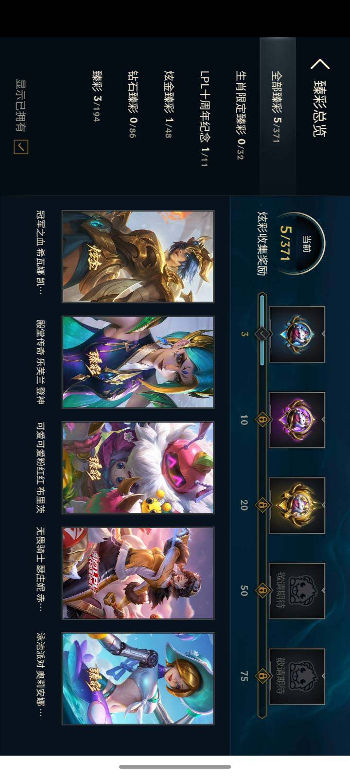 【至臻皮肤】:至臻黑夜使者李青,至臻黑夜使者李青(2022),至臻灵能特工伊泽瑞尔,至臻青花瓷拉克丝,至臻T1杰斯,至臻女帝黛安娜,至臻奥术师佐伊,至臻KDAALLOUT卡莎,至臻墨之影武者亚索,至臻未来战士卢锡安