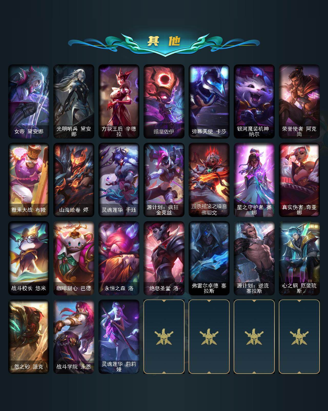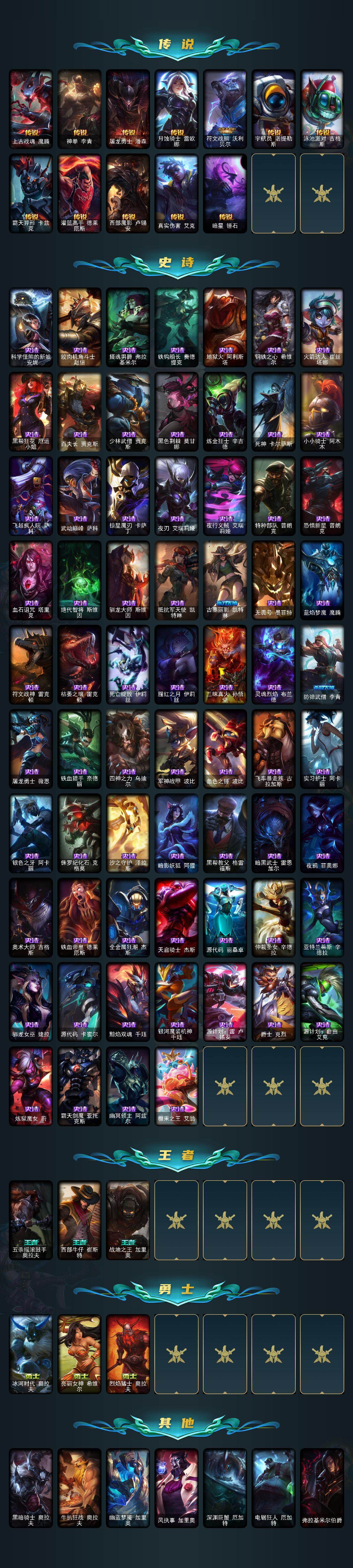【传说皮肤】:地狱之门卫士加里奥,魔幻卡牌崔斯特,邪鸦魅影乐芙兰,大天使长米迦勒凯尔,战场女武神凯尔,恶魔男爵瑞兹,提莫约德尔人的一大步,女皇艾希,西部天使艾希,恶魔之刃泰达米尔,绅士科加斯,陆地王者4WD布里茨,苹果机器人布里茨,冰川巨兽墨菲特,上古战魂魔腾,神拳李青,屠龙勇士潘森,月蚀骑士蕾欧娜,符文战熊沃利贝尔,宇航员诺提勒斯,泳池派对吉格斯,霸天异形卡兹克,灌篮高手德莱厄斯,西部魔影卢锡安,真实伤害艾克,暗星锤石