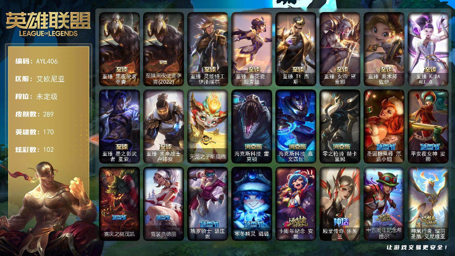 [15499717]【店主推荐捡漏号】未定级段位-170英雄-289皮肤-102炫彩-0终极-18神话-35限定-26传说-67史诗 【至臻皮肤】:至臻黑夜使者李青,至臻黑夜使者李青(2022),至臻灵能特工伊泽瑞尔,至臻青花瓷拉克丝,至臻T1杰斯,至臻女帝黛安娜,至臻奥术师佐伊,至臻KDAALLOUT卡莎,至臻墨之影武者亚索,至臻未来战士卢锡安 【臻彩皮肤】:无畏骑士瑟庄妮赤子初心,冠军之血希瓦娜凯旋圣装,泳池派对奥莉安娜优雅珠光鲸,可爱可爱粉红红布里茨,殿堂传奇乐芙兰登神 【年限皮肤】:天龙之子斯莫德 【海克斯皮肤】:海克斯科技雷克顿,海克斯科技嘉文四世,零之枪骑赫卡里姆 【冰雪限定】:圣诞糖果棒厄运小姐,平安夜女神娑娜,喜庆之树茂凯,雪装奈德丽,魄罗骑士瑟庄妮,寒冬精灵璐璐 【神话皮肤】:十周年纪念安妮,殿堂传奇乐芙兰,十五周年纪念希维尔,神凰行者瑞羽圣凰艾尼维亚,灰烬骑士派克,海克斯科技嘉文四世,海克斯科技雷克顿,零之枪骑赫卡里姆,至臻奥术师佐伊,至臻黑夜使者李青,至臻黑夜使者李青2022,至臻KDAALLOUT卡莎,至臻灵能特工伊泽瑞尔,至臻墨之影武者亚索,至臻女帝黛安娜,至臻青花瓷拉克丝,至臻未来战士卢锡安 【限定皮肤】:创星之灵璐璐,SKTT1贾克斯,SKTT1劫,SKTT1婕拉,SSW图奇,SSW泰隆,SKTT1雷克顿,SKTT1瑞兹,SKTT1辛德拉,SSG纳尔,iG卡蜜尔,DWG凯南,胜利女神瑟庄妮,胜利凤凰艾尼维亚,胜利之王泰达米尔,胜利巨口克格莫,胜利女神娑娜,胜利剑圣易,鬼影重重魔腾,鬼影森森茂凯,泳池派对奥莉安娜,泳池派对菲奥娜,泳池派对凯特琳,泳池派对塔莉垭,暗影沃里克,野兽猎人泰达米尔,永恒之森乐芙兰,都铎王朝图奇 【传说皮肤】:地狱之门卫士加里奥,魔幻卡牌崔斯特,邪鸦魅影乐芙兰,大天使长米迦勒凯尔,战场女武神凯尔,恶魔男爵瑞兹,提莫约德尔人的一大步,女皇艾希,西部天使艾希,恶魔之刃泰达米尔,绅士科加斯,陆地王者4WD布里茨,苹果机器人布里茨,冰川巨兽墨菲特,上古战魂魔腾,神拳李青,屠龙勇士潘森,月蚀骑士蕾欧娜,符文战熊沃利贝尔,宇航员诺提勒斯,泳池派对吉格斯,霸天异形卡兹克,灌篮高手德莱厄斯,西部魔影卢锡安,真实伤害艾克,暗星锤石 【史诗皮肤】:科学怪熊的新娘安妮,绞肉机角斗士赵信,摄魂男爵弗拉基米尔,铁钩船长费德提克,地狱火阿利斯塔,钢铁之心希维尔