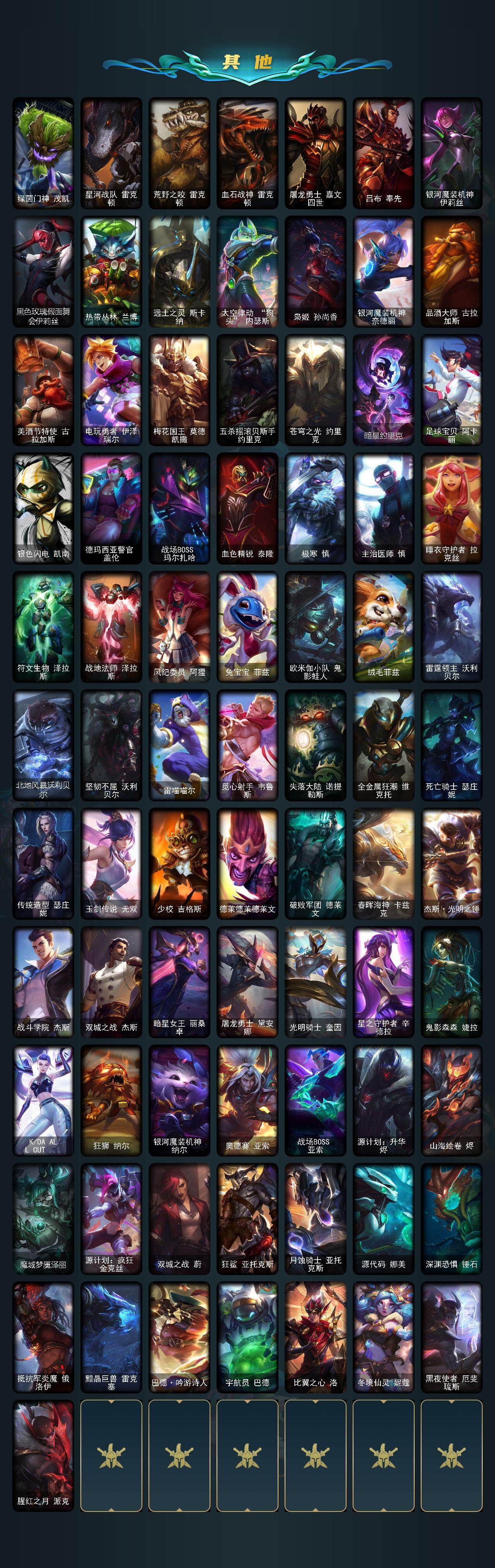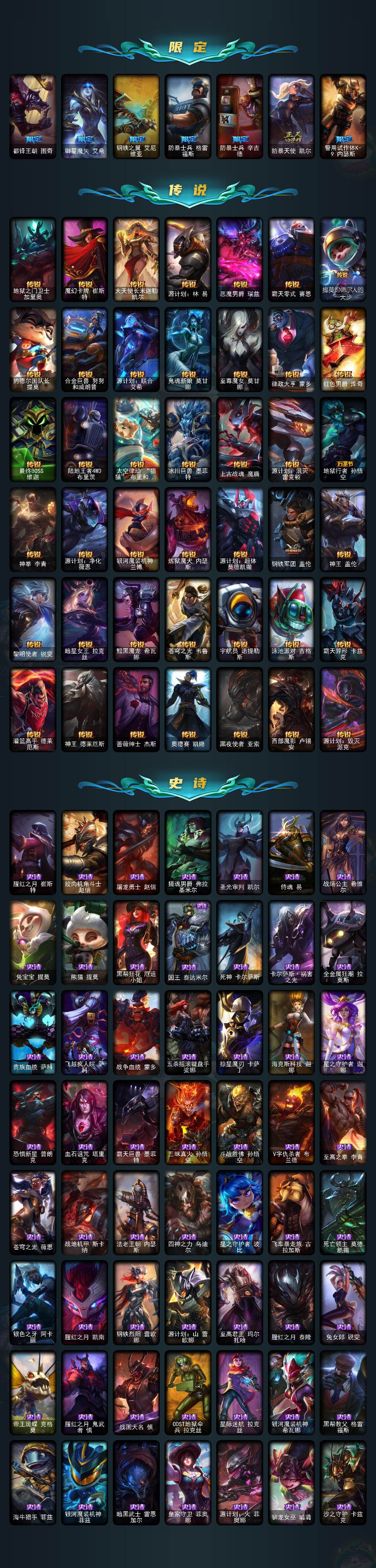 【传说皮肤】:地狱之门卫士加里奥,魔幻卡牌崔斯特,大天使长米迦勒凯尔,源计划林易,恶魔男爵瑞兹,霸天零式赛恩,提莫约德尔人的一大步,约德尔国队长提莫,合金巨兽努努和威朗普,源计划联合艾希,鬼魂新娘莫甘娜,至尊魔女莫甘娜,律政大亨蒙多,红色男爵库奇,最终BOSS维迦,陆地王者4WD布里茨,太空律动猫猫布里和里茨,冰川巨兽墨菲特,上古战魂魔腾,源计划泯灭雷克顿,地狱行