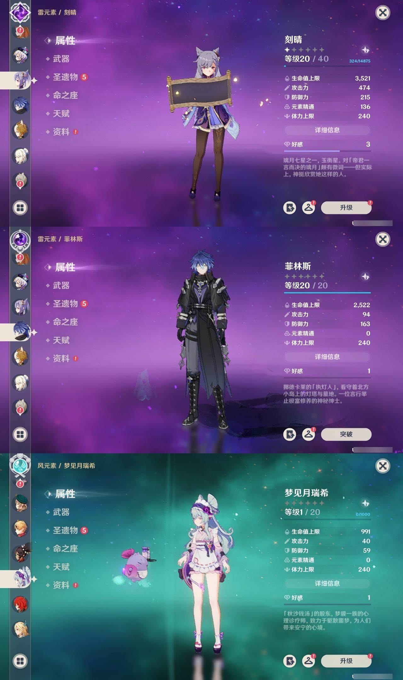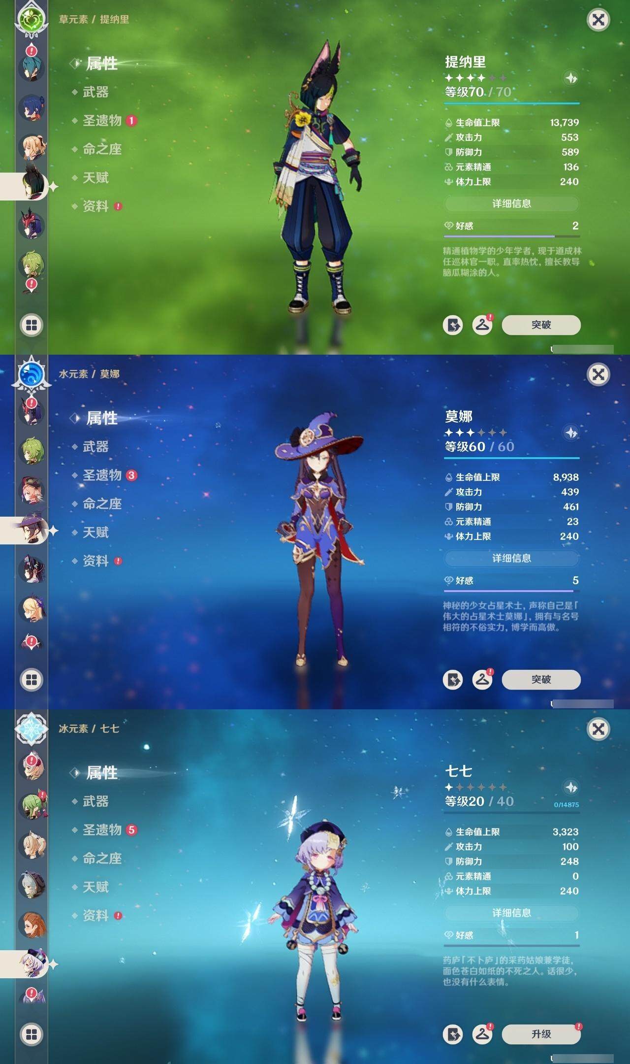 0命赛诺,0命提纳里,0命夜兰,0命神里绫人,0命雷电将军,0命枫原万叶,0命钟离,0命胡桃,0命达达利亚,0命刻晴,0命七七,2命琴,1命莫娜,0命迪卢克,0命梦见月瑞希,0命菲林斯,精1静水流涌之辉,精1圣显之钥,精1若水,精1波乱月白经津,精1终末嗟叹之诗,精1无工之剑,精1和璞鸢,精1天空之翼,精1阿莫斯之弓,精1风鹰剑,精1狼的末路