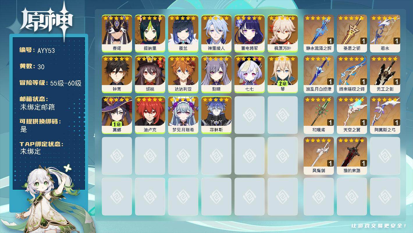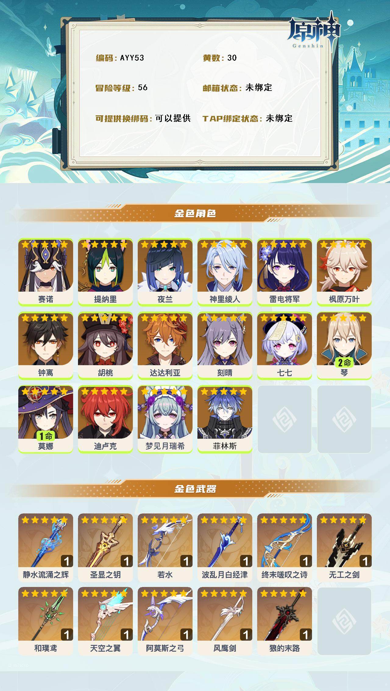 [15500140]56级/30黄/女主/16个五星角色/11个五星武器 0命赛诺,0命提纳里,0命夜兰,0命神里绫人,0命雷电将军,0命枫原万叶,0命钟离,0命胡桃,0命达达利亚,0命刻晴,0命七七,2命琴,1命莫娜,0命迪卢克,0命梦见月瑞希,0命菲林斯,精1静水流涌之辉,精1圣显之钥,精1若水,精1波乱月白经津,精1终末嗟叹之诗,精1无工之剑,精1和璞鸢,精1天空之翼,精1阿莫斯之弓,精1风鹰剑,精1狼的末路