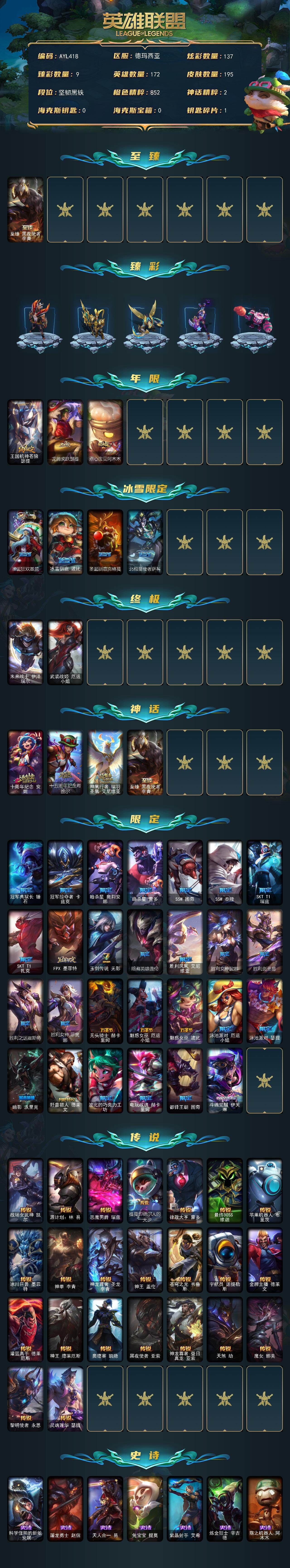 [15501878]【特价出售/店主推荐】未定级段位-172英雄-195皮肤-137炫彩-2终极-4神话-35限定-23传说-31史诗