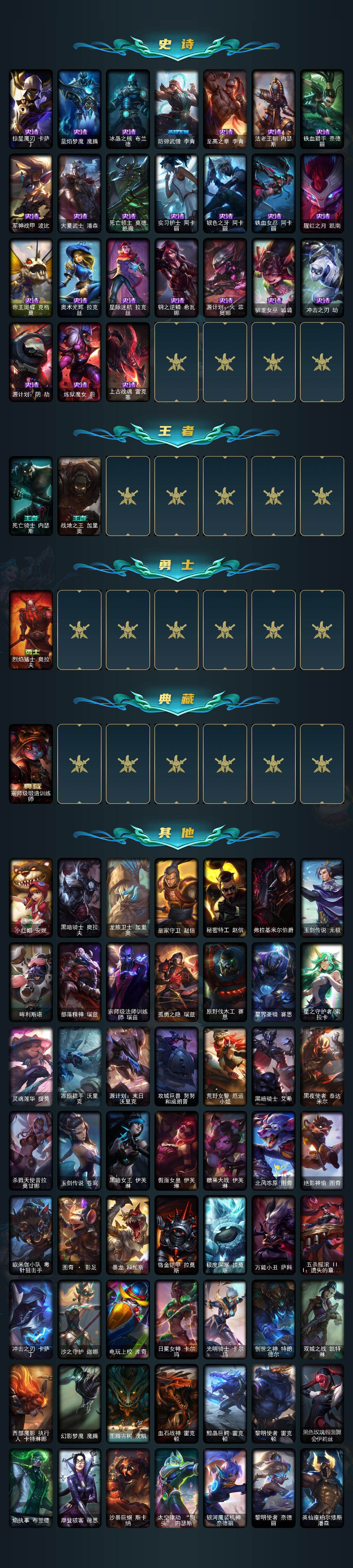 【史诗皮肤】:科学怪熊的新娘安妮,屠龙勇士赵信,天人合一易,兔宝宝提莫,紫晶射手艾希,炼金狂士辛吉德,殇之机器人阿木木,掠星魔刃卡萨丁,蓝焰梦魔魔腾,冰晶之核布兰德,防弹武僧李青,至高之拳李青,法老王朝内瑟斯,铁血猎手奈德丽,军神战甲波比,大夏武士潘森,死亡领主莫德凯撒,实习护士阿卡丽,银色之牙阿卡丽,铁血女忍阿卡丽,腥红之月凯南,帝王斑蝶克格莫,奥术光辉拉克丝,星际迷航拉克丝,钢之逆鳞希瓦娜,源计划火菲奥娜,驯龙女巫璐璐,冲击之刃劫,源计划阴劫,炼狱魔女蔚,上古战魂雷克塞