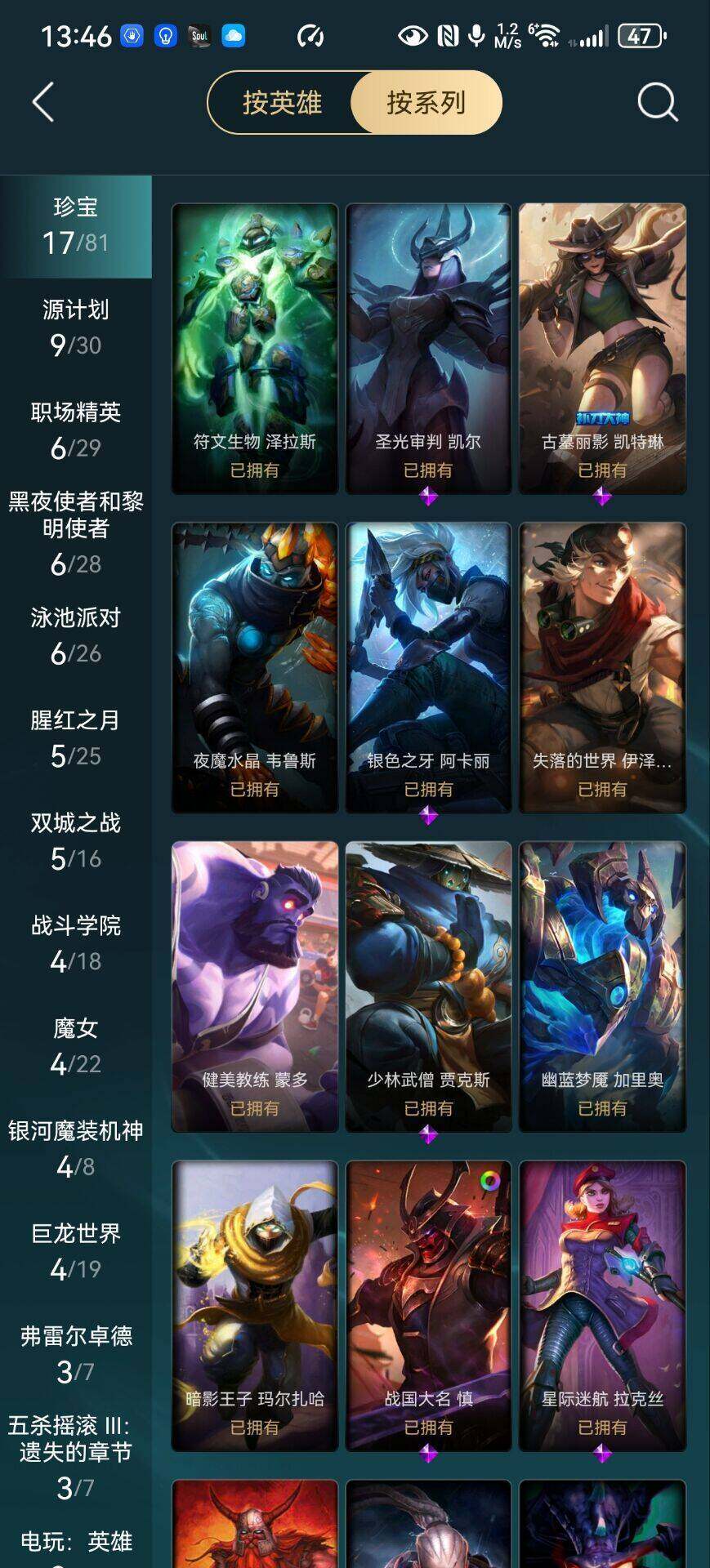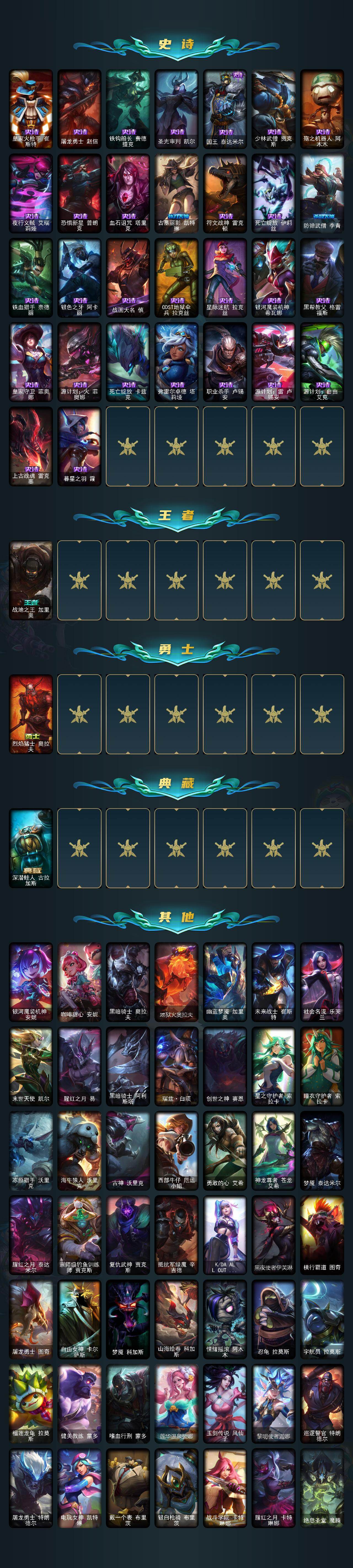 【史诗皮肤】:皇家火枪手崔斯特,屠龙勇士赵信,铁钩船长费德提克,圣光审判凯尔,国王泰达米尔,少林武僧贾克斯,殇之机器人阿木木,夜行义贼艾瑞莉娅,恐惧新星普朗克,血石诅咒塔里克,古墓丽影凯特琳,符文战神雷克顿,死亡绽放伊莉丝,防弹武僧李青,铁血猎手奈德丽,银色之牙阿卡丽,战国大名慎,ODST地狱伞兵拉克丝,星际迷航拉克丝,银河魔装机神希瓦娜,黑帮教父格雷福斯,皇家守卫菲奥娜,源计划火菲奥娜,死亡绽放卡兹克,弗雷尔卓德塔莉垭,职业杀手卢锡安,源计