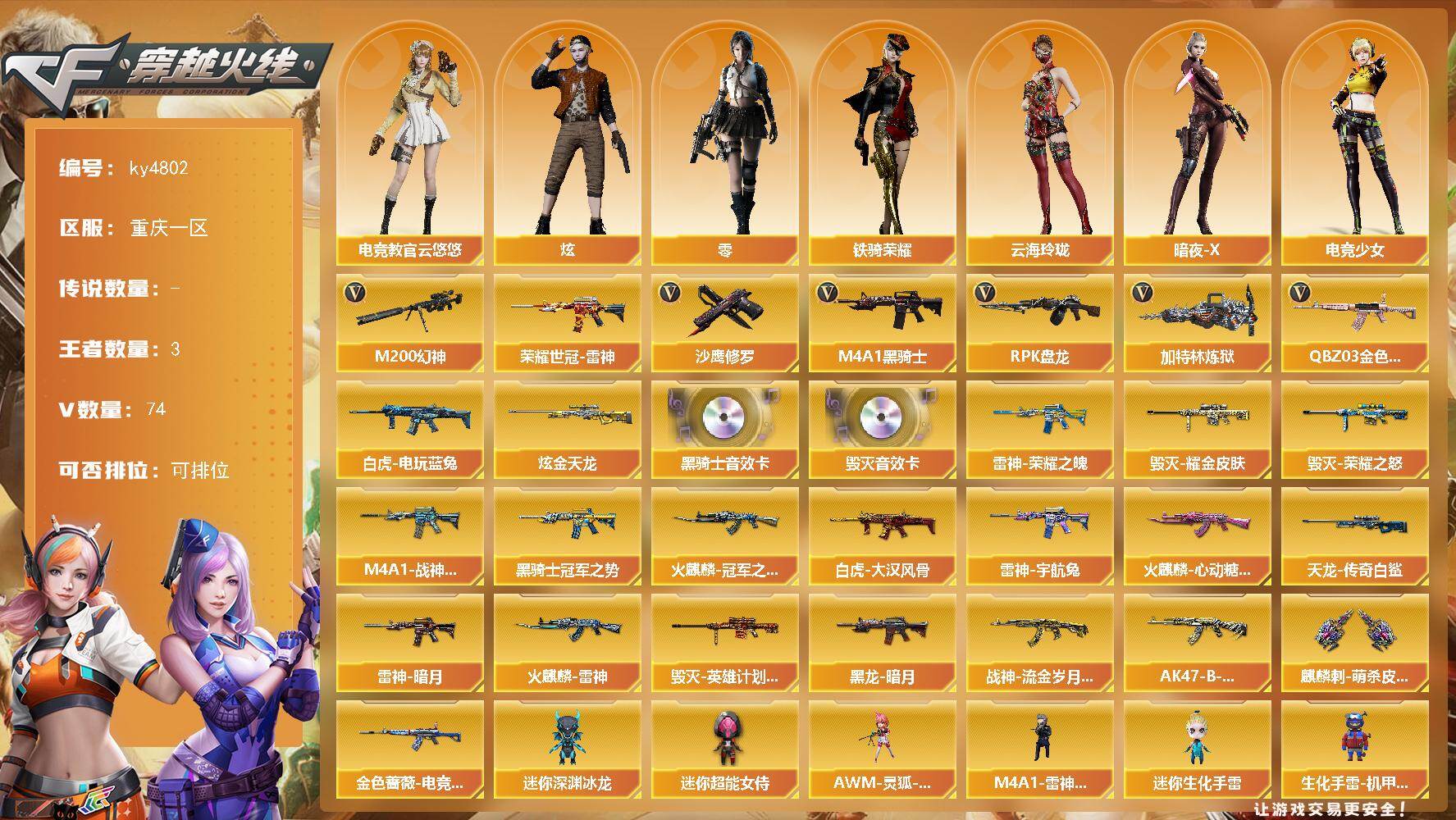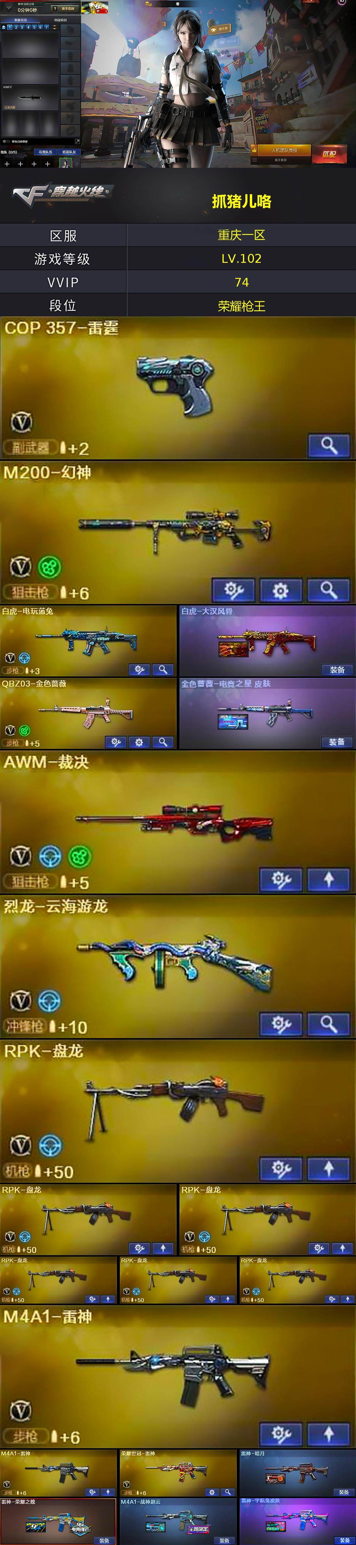 [15503027]重庆一区-74V-3王者-1炫金 【热门武器】:QBZ03-金色蔷薇,M200-幻神,荣耀世冠-雷神,白虎-电玩蓝兔,M4A1-黑骑士,RPK-盘龙*6,加特林-炼狱,沙鹰-修罗*4 【王者炫金武器】:炫金天龙 【音效卡】:M4A1-黑骑士音效卡,Barrett-毁灭音效卡 【皮肤】:白虎-大汉风骨,金色蔷薇-电竞之星 皮肤,雷神-暗月,雷神-荣耀之魄,M4A1-战神赵云,雷神-宇航兔皮肤,火麒麟-雷神,火麒麟-冠军之心,火麒麟-心动糖果,毁灭-荣耀之怒,毁灭耀金皮肤,毁灭-英雄计划 皮肤,黑龙-暗月,黑骑士-冠军之势,战神-流金岁月皮肤,AK47-B-常胜将军-刘备,AWM-天龙-传奇白鲨,麒麟刺-萌杀皮肤 【角色】:零,炫,电竞教官-云悠悠,云海玲珑,暗夜-X,电竞少女,风暴女*2,嘉年华灵狐,兰-海滩派对,灵狐者-X,灵狐者-黄金海岸,麻雀,曼陀罗-X,潘多拉-X,潘多拉-甜心教官,潜龙队-X,斯沃特-X,铁骑荣耀,兔囡囡,新娜塔莎,影武者-X 【人偶武器】:M4A1-雷神-精英刀锋,AWM-灵狐-15周年嘉年华,迷你深渊冰龙,迷你生化手雷,生化手雷-机甲核心,迷你超能女侍 【暴走生化】:超级对讲机 【挑战大师】:冰龙粉碎者-白马银枪*2 【英雄级武器】:AK47-火麒麟,M4A1-黑龙,M4A1-雷神*2,M4A1-黑骑士,AK12-天启,无影-神兵利器,黑武士-锦绣游龙,QBZ03-金色蔷薇,王者之心-觉醒版,AK-47-猩红传说,白虎-电玩蓝兔,荣耀世冠-雷神,AWM-天龙,Barrett-毁灭,Barrett-极光,AWM-裁决,M200-幻神,RPK-盘龙*6,加特林-炼狱,烈龙-云海游龙,沙鹰-修罗*4,沙鹰-天神,COP-雷霆,屠龙*2,龙啸,擎天,麒麟刺,擎天-云海游龙,屠龙-云海游龙,王者之击-觉醒版,高爆手雷-雷霆*5,高爆手雷-雷暴,高爆手雷-竞技荣光*3,高爆手雷-神工天巧,手雷-云海游龙,闪光弹-雷霆*5,闪光弹-雷暴,闪光弹-竞技荣光*2,烟雾弹-雷霆*5,烟雾弹-竞技荣光*2,烟雾弹-雷霆王者-觉醒版,M4A1-赤狱骑士 【道具】:BS战队炫彩背包,云山科技背包,云海游龙炫彩背包,全能枪王背包,战舰背包,炫彩背包,背包-洛丽塔,虎牙炫彩背包,超级背包,哔哩哔哩名片,救世主-黑桃战神,绿色巨人,灵魂忍者,迷雾幽灵,生化弹匣,夺命之