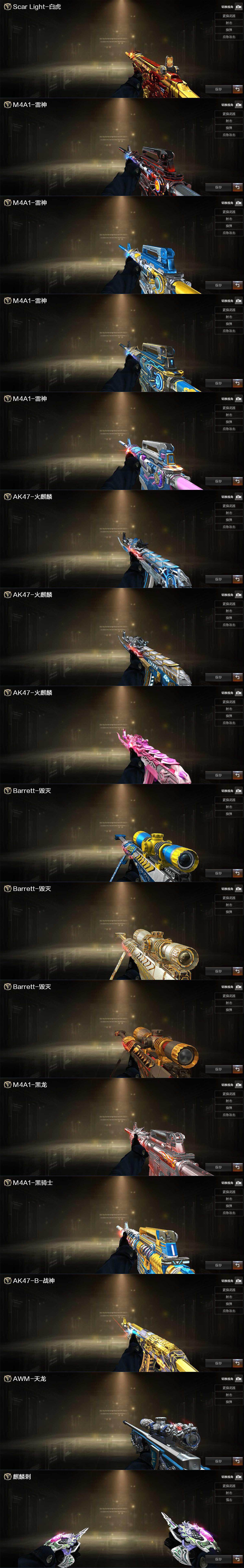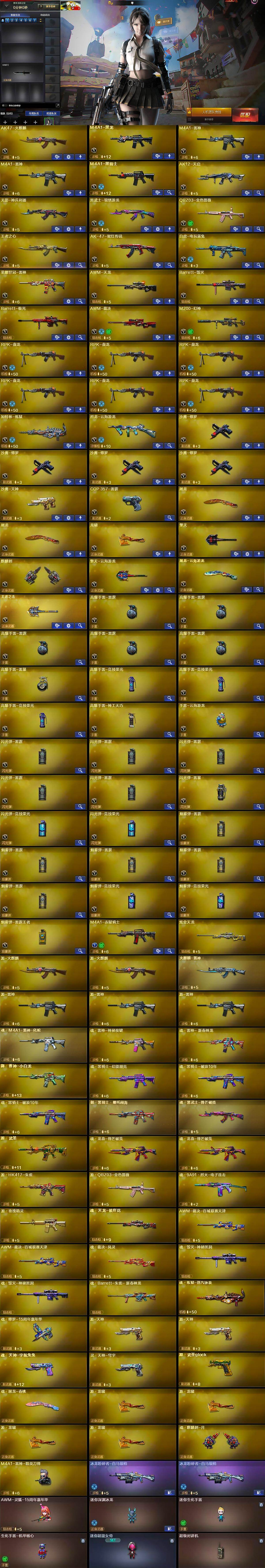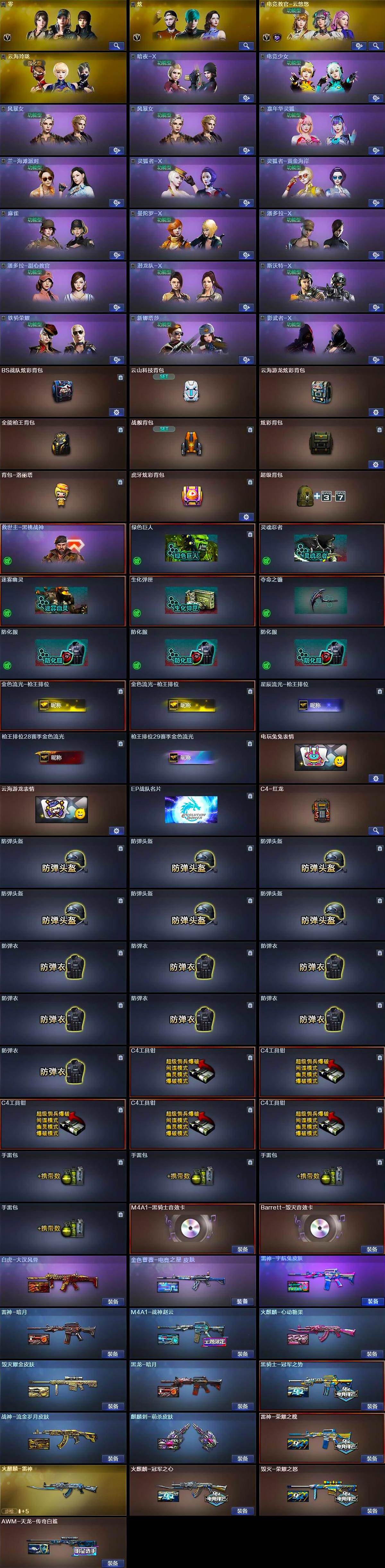 【英雄级武器】:AK47-火麒麟,M4A1-黑龙,M4A1-雷神*2,M4A1-黑骑士,AK12-天启,无影-神兵利器,黑武士-锦绣游龙,QBZ03-金色蔷薇,王者之心-觉醒版,AK-47-猩红传说,白虎-电玩蓝兔,荣耀世冠-雷神,AWM-天龙,Barrett-毁灭,Barrett-极光,AWM-裁决,M200-幻神,RPK-盘龙*6,加特林-炼狱,烈龙-云海游龙,沙鹰-修罗*4,沙鹰-天神,COP-雷霆,屠龙*2,龙啸,擎天,麒麟刺,擎天-云海游龙,屠龙-云海游龙,王者之击-觉醒版,高爆手雷-雷霆*5,高爆手雷-雷暴,高爆手雷-竞技荣光*3,高爆手雷-神工天巧,手雷-云海游龙,闪光弹-雷霆*5,闪光弹-雷暴,闪光弹-竞技荣光*2,烟雾弹-雷霆*5,烟雾弹-竞技荣光*2,烟雾弹-雷霆王者-觉醒版,M4A1-赤狱骑士