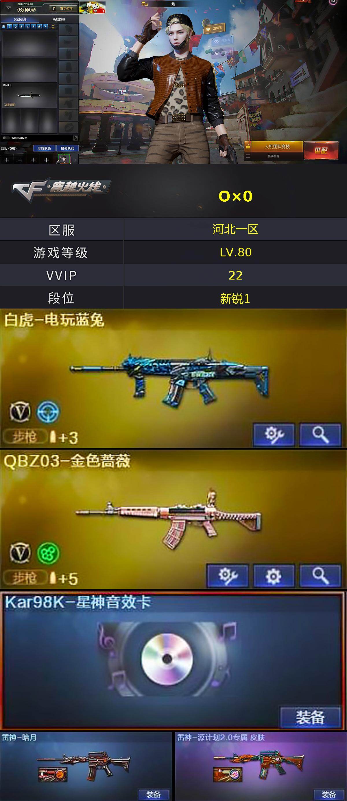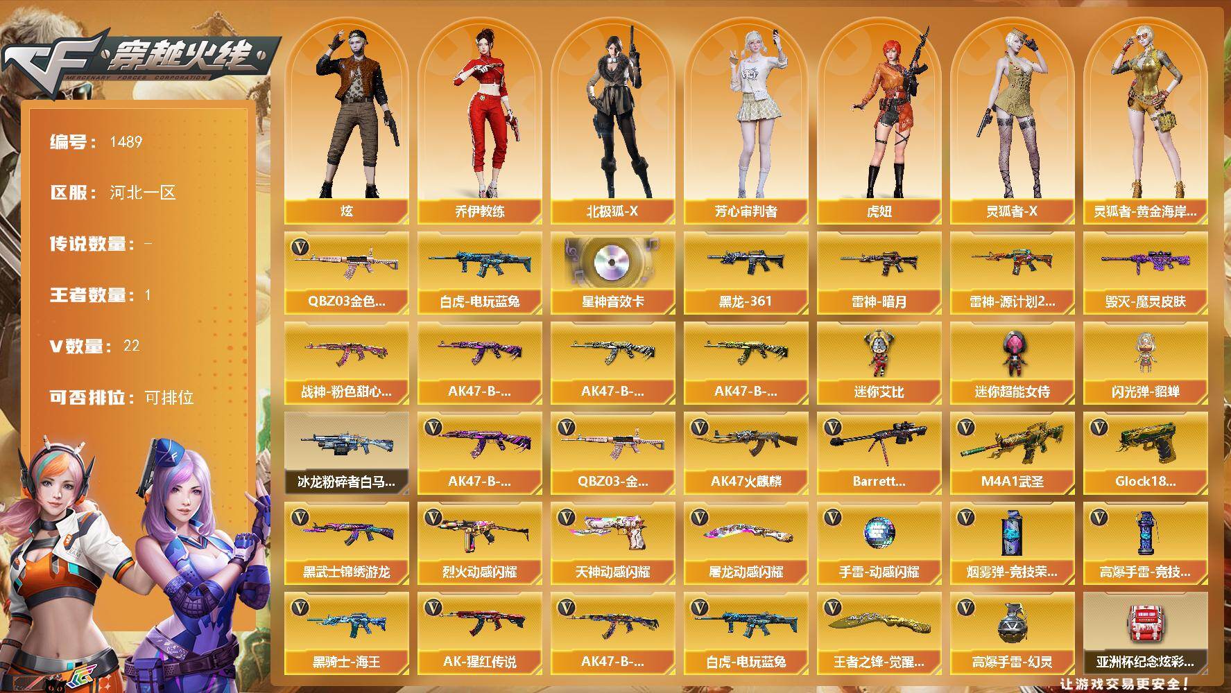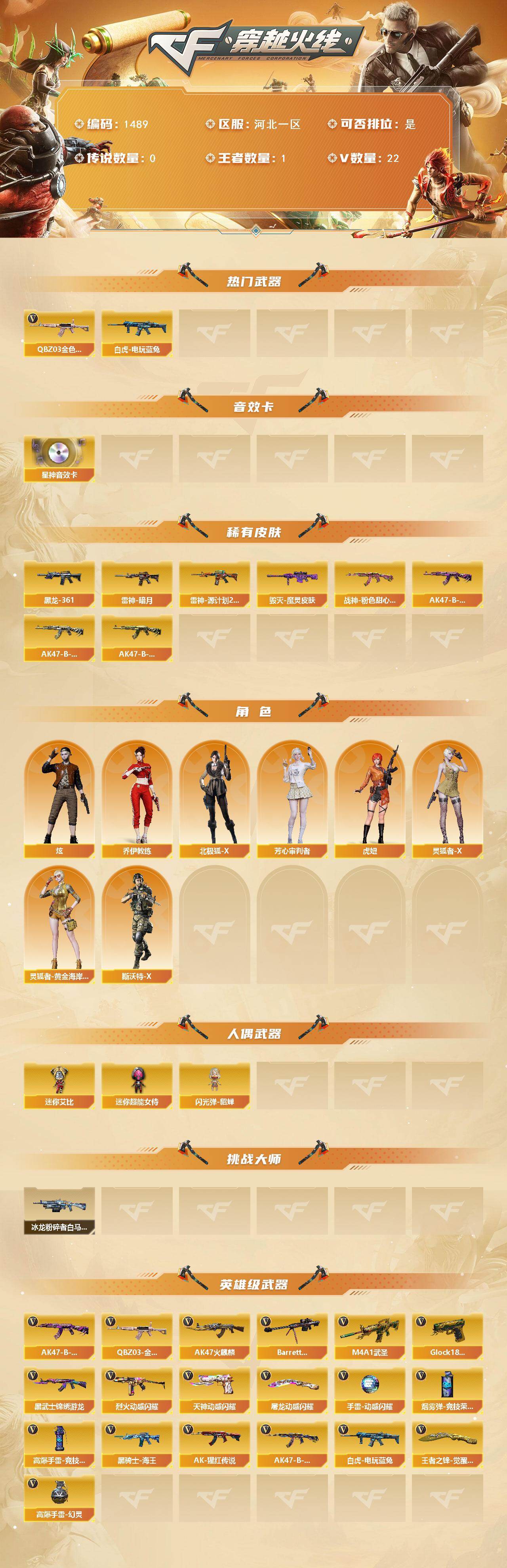 [15504337]河北一区-22V-1王者-0炫金 【热门武器】:QBZ03-金色蔷薇,白虎-电玩蓝兔 【音效卡】:Kar98K-星神音效卡 【皮肤】:雷神-暗月,雷神-源计划2.0专属 皮肤,毁灭-魔灵皮肤,M4A1-黑龙-361,战神-粉色甜心皮肤,AK47-B-常胜将军-曹操,AK47-B-常胜将军-刘备*2,AK47-B-常胜将军-孙权 【角色】:炫,乔伊教练,北极狐-X,芳心审判者,虎妞,灵狐者-X,