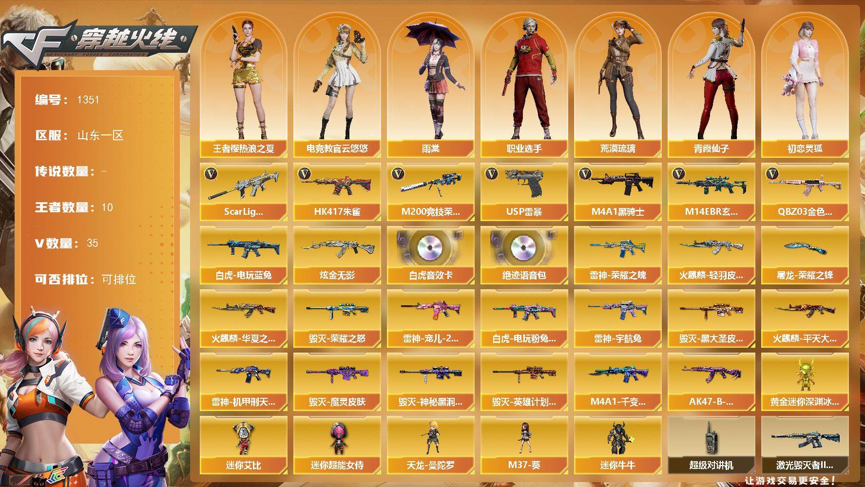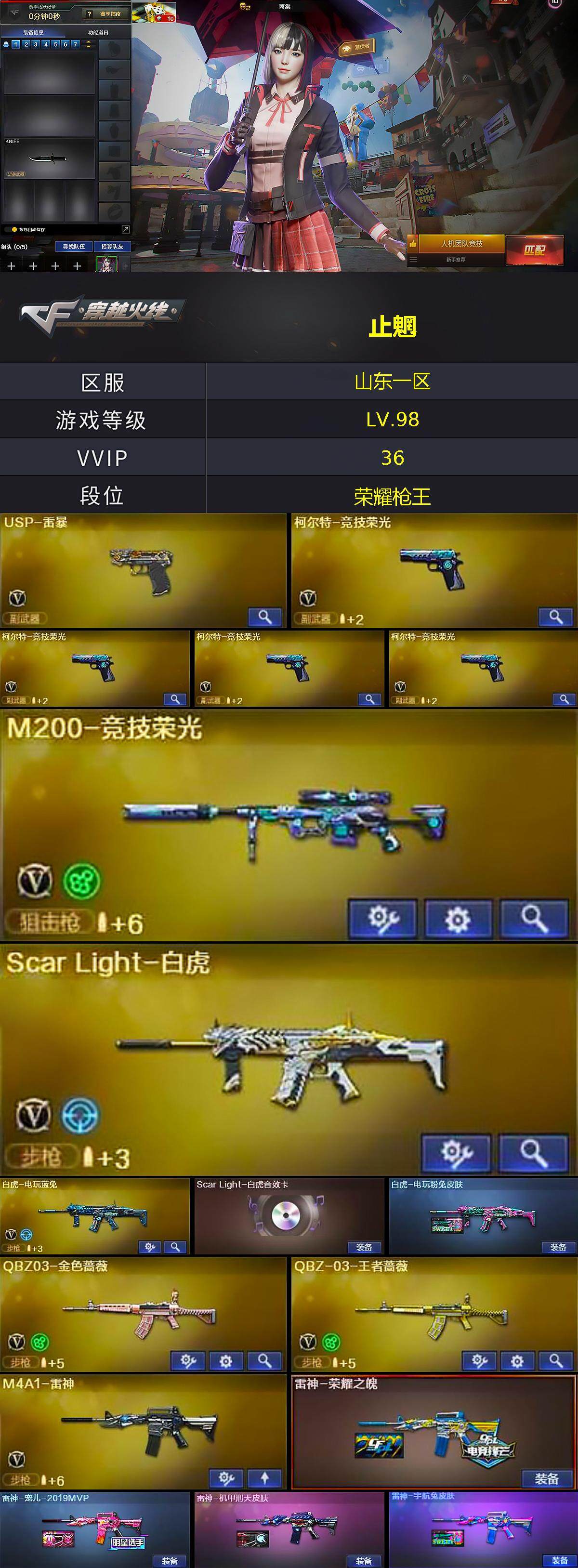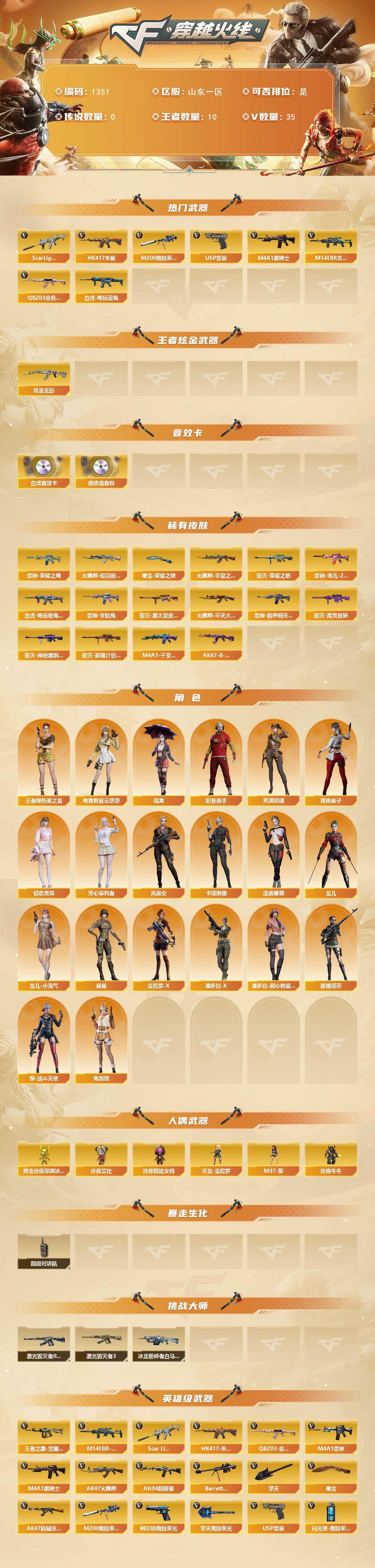 [15505195]山东一区-35V-10王者-1炫金 【热门武器】:QBZ03-金色蔷薇,M14EBR-玄武,Scar Light-白虎,HK417-朱雀,M200-竞技荣光,白虎-电玩蓝兔,M4A1-黑骑士,USP-雷暴 【王者炫金武器】:炫金无影 【音效卡】:Scar Light-白虎音效卡,绝迹语音包 【皮肤】:白虎-电玩粉兔皮肤,雷神-荣耀之魄,雷神-宠儿-2019MVP,雷神-机甲刑天皮肤,雷神-宇航兔皮肤,火麒麟-华夏之心,火麒麟-轻羽皮肤,火麒麟-平天大圣,毁灭-荣耀之怒,毁灭-黑大圣皮肤,毁灭-魔灵皮肤,毁灭-神秘黑洞皮肤,毁灭-英雄计划 皮肤,M4A1-千变-孔明皮肤,AK47-B-常胜将军-曹操*2,屠龙-荣耀之锋 【角色】:雨棠,电竞教官-云悠悠,荒漠琉璃,王者樱-热浪之夏,初恋灵狐,芳心审判者,风暴女,卡塔琳娜,流浪蔷薇,龙儿,龙儿-小淘气,麻雀,曼陀罗-X,潘多拉-X,潘多拉-甜心教官,青霞仙子,兔囡囡,新娜塔莎,樱-战斗天使,职业选手 【人偶武器】:天龙-曼陀罗,M37-葵,黄金迷你深渊冰龙*2,迷你牛牛,迷你艾比,迷你超能女侍 【暴走生化】:超级对讲机 【挑战大师】:冰龙粉碎者-白马银枪,激光毁灭者III-白马银枪,激光毁灭者III 【英雄级武器】:AK47-火麒麟,M4A1-雷神,M4A1-黑骑士,AN94-超新星,AK47-机械迷城,HK417-朱雀,Scar Light-白虎,M14EBR-玄武,QBZ03-金色蔷薇,王者之影-觉醒版*2,AK-47-猩红传说*2,QBZ-03-王者蔷薇-觉醒版,白虎-电玩蓝兔,Barrett-毁灭,M200-竞技荣光,王者之霆-觉醒版,USP-雷暴,柯尔特-竞技荣光*4,王者之灵-觉醒版,屠龙,擎天,擎天-竞技荣光,王者之锋-觉醒版*2,高爆手雷-竞技荣光*3,闪光弹-竞技荣光*3,闪光弹-雷霆王者-觉醒版*2,烟雾弹-竞技荣光*3,M4A1-赤狱骑士 【道具】:云山科技背包,亚洲杯纪念炫彩背包,虎牙炫彩背包,救世主-黑桃战神,黄金生化钩,绿色巨人,灵魂忍者,迷雾幽灵,生化弹匣,夺命之镰,防化服*3,金色流光-枪王排位,星辰流光-枪王排位,流光-再燃火线,枪王排位28赛季金色流光,枪王排位29赛季金色流光,电玩兔兔表情,防弹头盔*3,防弹衣*3,C4工具钳*3,手雷包*3 【特殊枪械】:1白虎,1黑骑士
