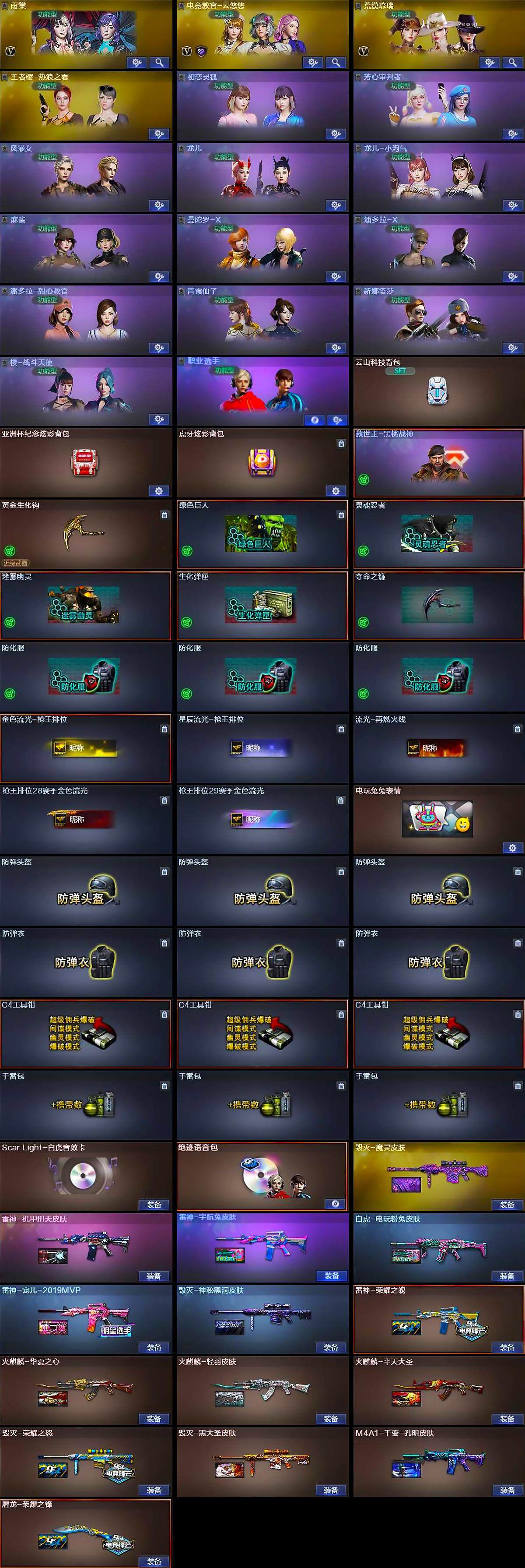 【道具】:云山科技背包,亚洲杯纪念炫彩背包,虎牙炫彩背包,救世主-黑桃战神,黄金生化钩,绿色巨人,灵魂忍者,迷雾幽灵,生化弹匣,夺命之镰,防化服*3,金色流光-枪王排位,星辰流光-枪王排位,流光-再燃火线,枪王排位28赛季金色流光,枪王排位29赛季金色流光,电玩兔兔表情,防弹头盔*3,防弹衣*3,C4工具钳*3,手雷包*3