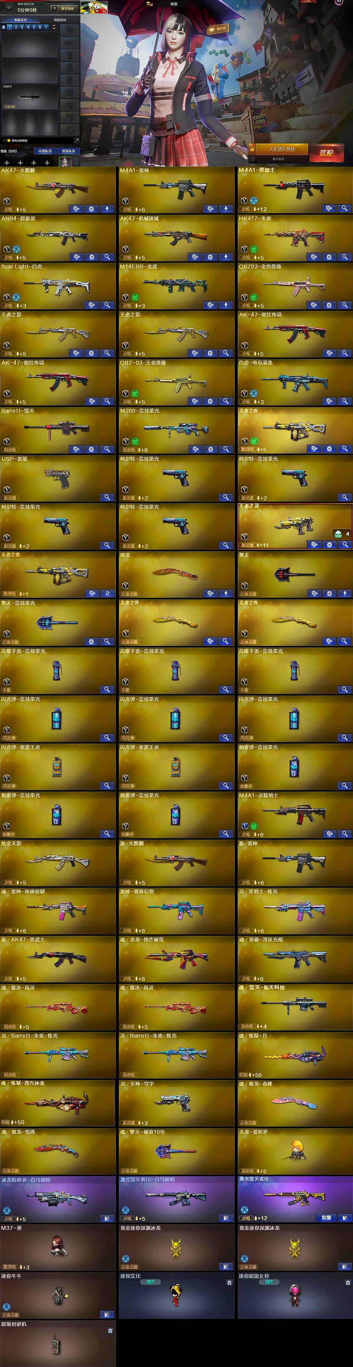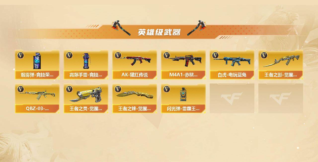 【英雄级武器】:AK47-火麒麟,M4A1-雷神,M4A1-黑骑士,AN94-超新星,AK47-机械迷城,HK417-朱雀,Scar Light-白虎,M14EBR-玄武,QBZ03-金色蔷薇,王者之影-觉醒版*2,AK-47-猩红传说*2,QBZ-03-王者蔷薇-觉醒版,白虎-电玩蓝兔,Barrett-毁灭,M200-竞技荣光,王者之霆-觉醒版,USP-雷暴,柯尔特-竞技荣光*4,王者之灵-觉醒版,屠龙,擎天,擎天-竞技荣光,王者之锋-觉醒版*2,高爆手雷-竞技荣光*3,闪光弹-竞技荣光*3,闪光弹-雷霆王者-觉醒版*2,烟雾弹-竞技荣光*3,M4A1-赤狱骑士