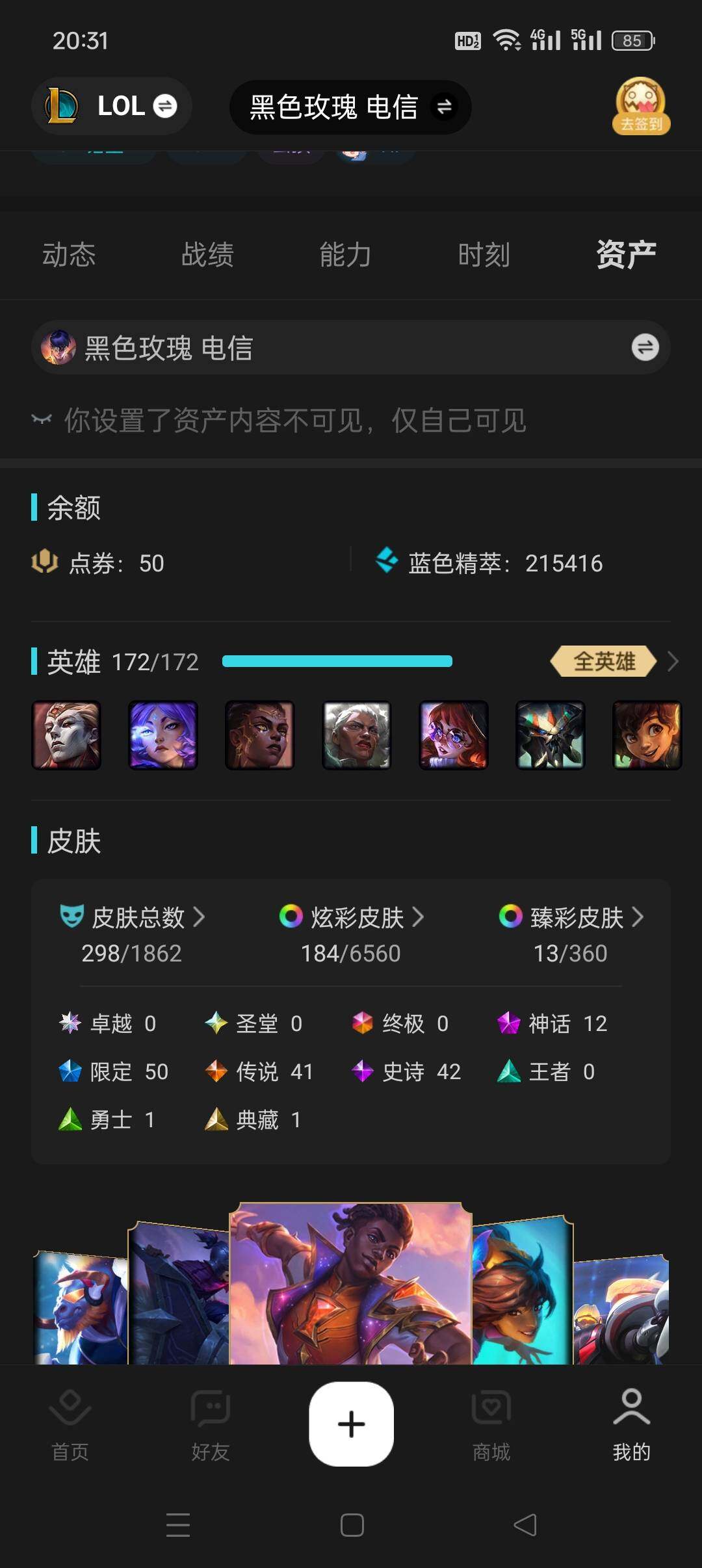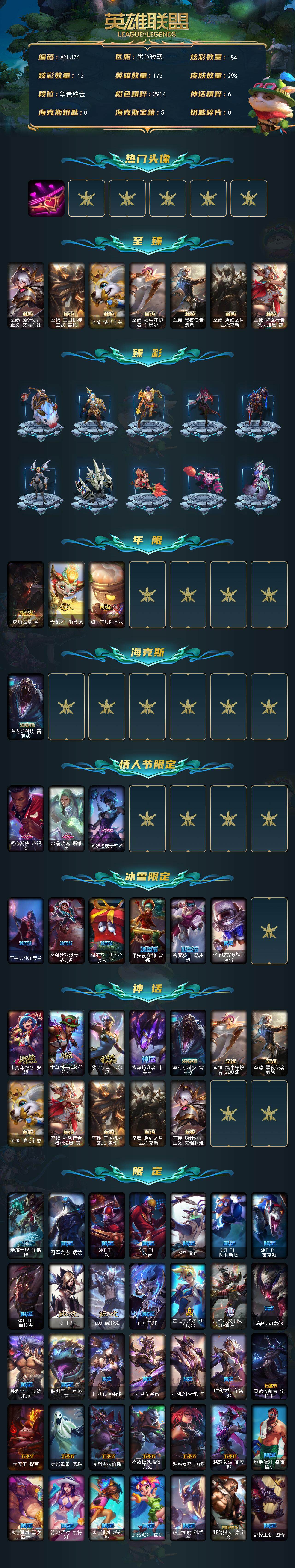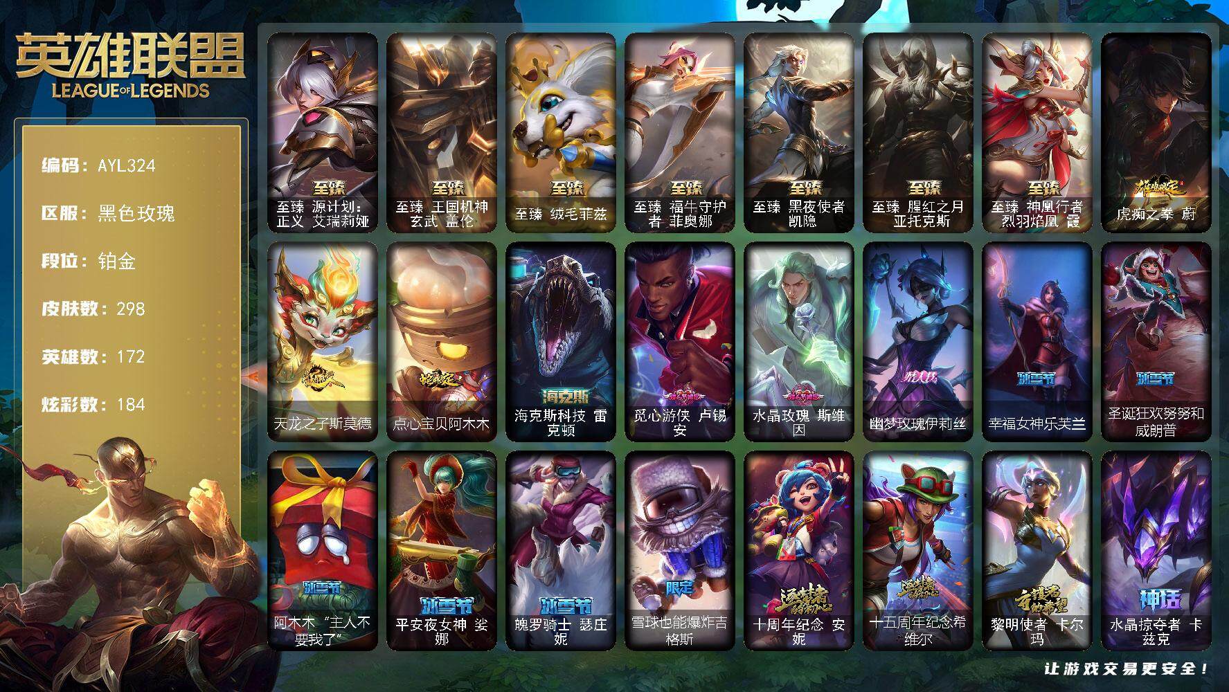[15506663]【店主推荐捡漏号】铂金段位-172英雄-298皮肤-184炫彩-0终极-12神话-50限定-41传说-42史诗