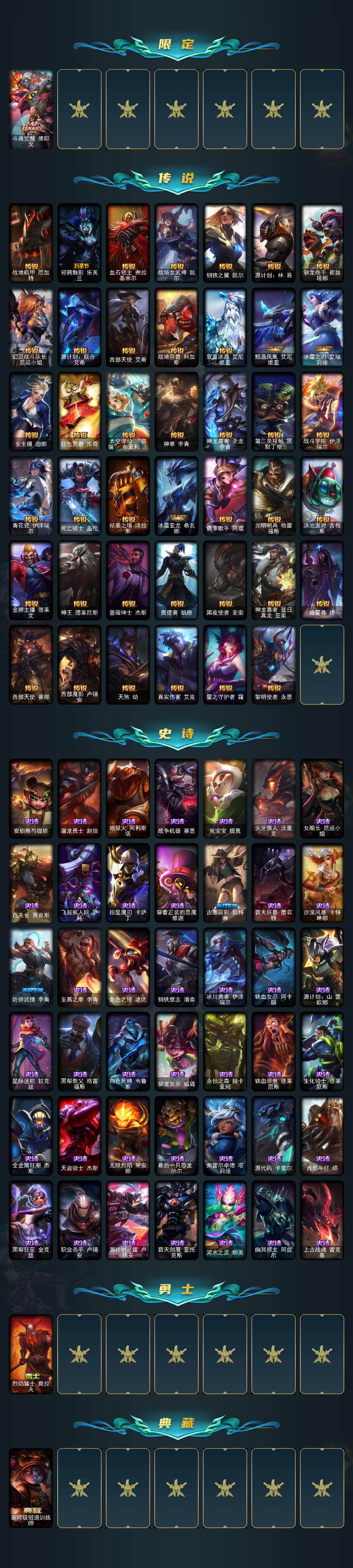 【传说皮肤】:战地机甲厄加特,邪鸦魅影乐芙兰,血石领主弗拉基米尔,战场女武神凯尔,钢铁之翼凯尔,源计划林易,驯龙炮手崔丝塔娜,幻灵战斗队长厄运小姐,源计划联合艾希,西部天使艾希,战地巨兽科加斯,双重冰晶艾尼维亚,黯晶凤凰艾尼维亚