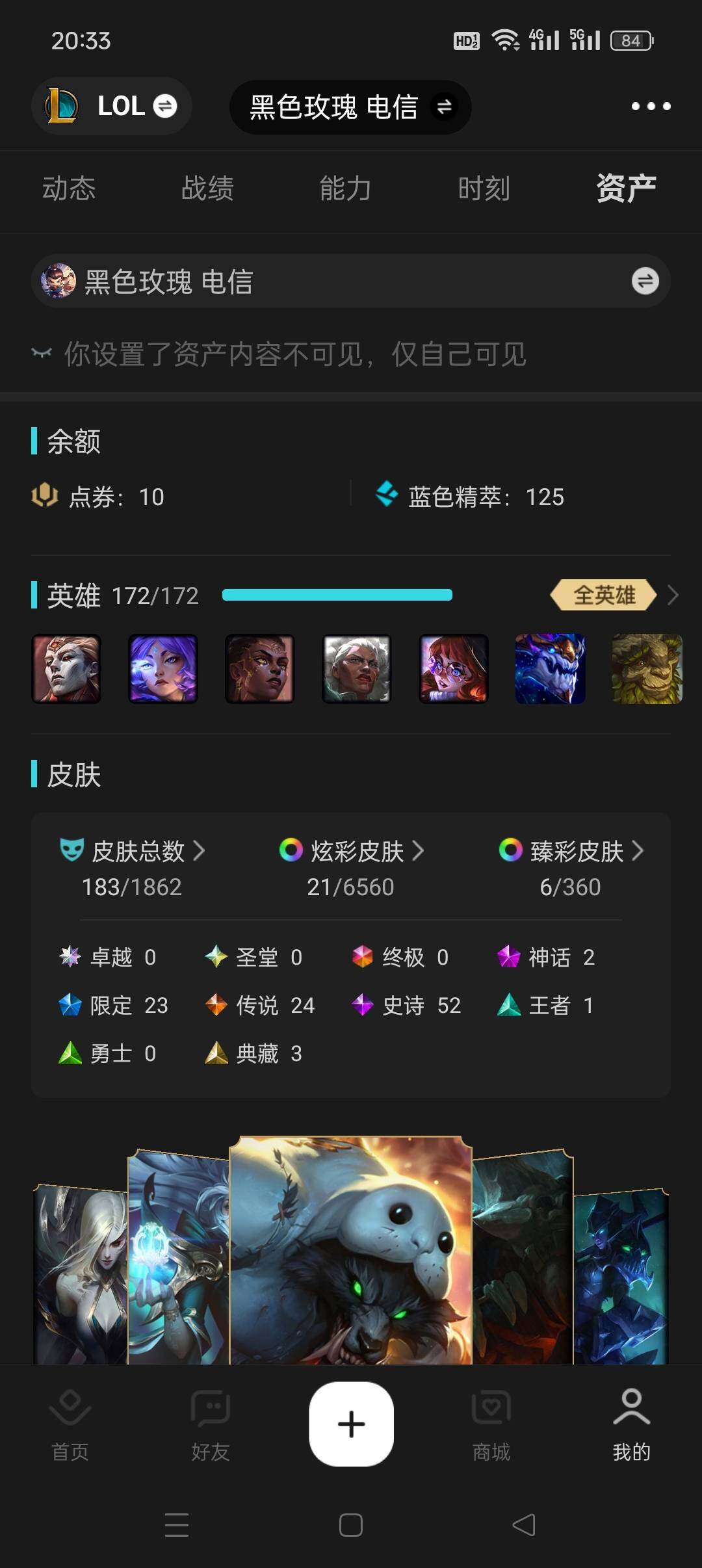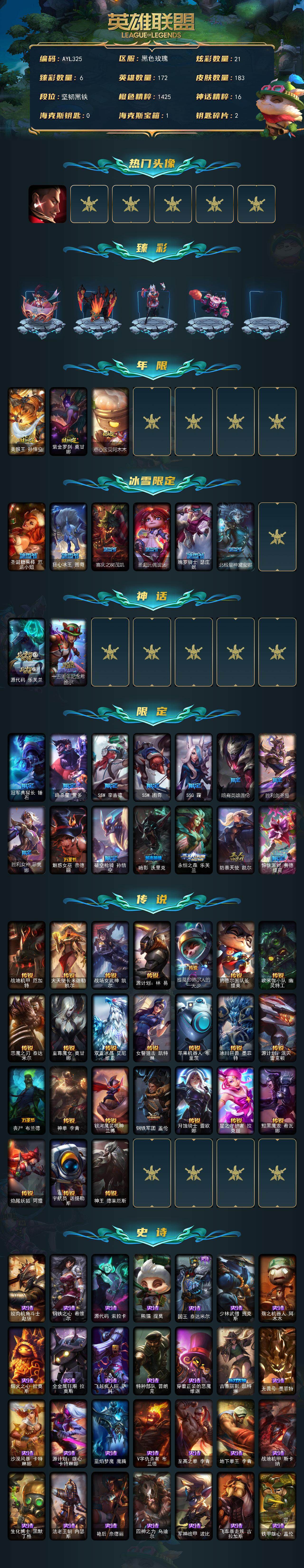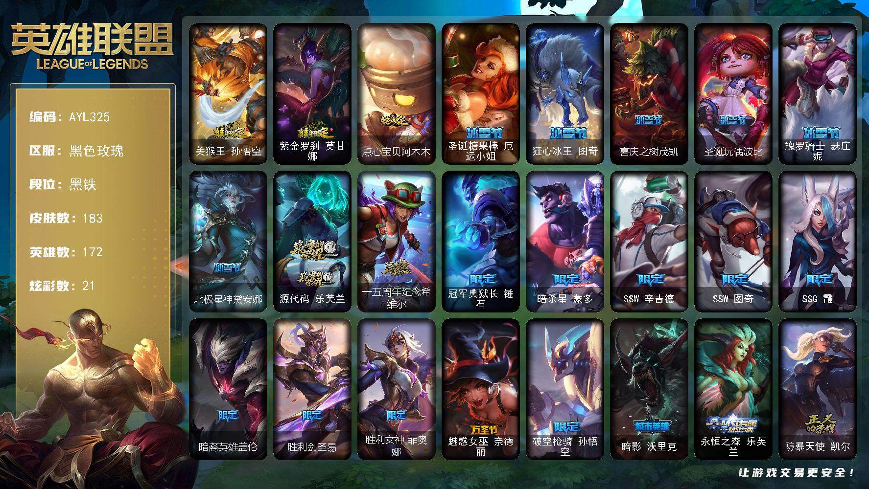 [15506888]【店主推荐捡漏号】黑铁段位-172英雄-183皮肤-21炫彩-0终极-2神话-23限定-24传说-52史诗
