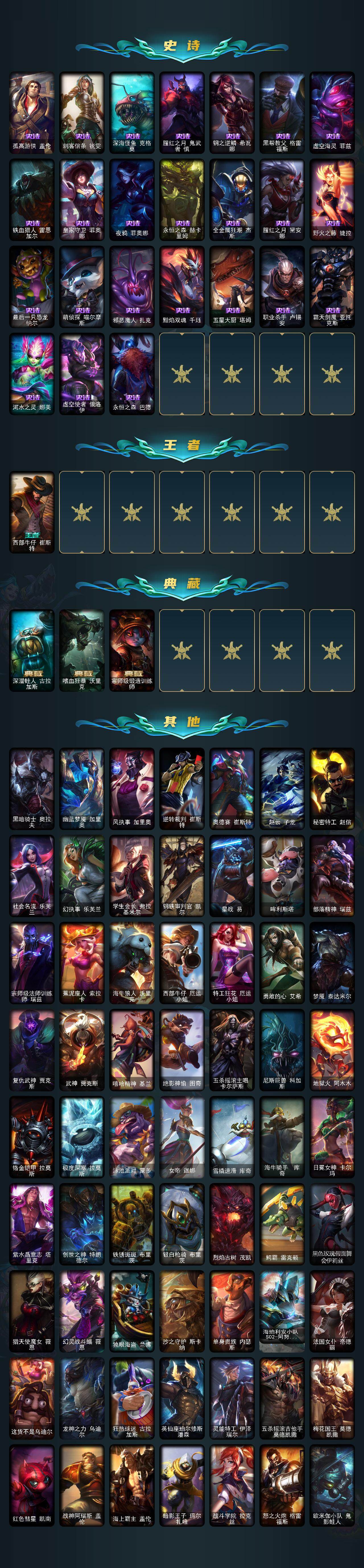 【史诗皮肤】:绞肉机角斗士赵信,钢铁之心希维尔,源代码索拉卡,熊猫提莫,国王泰达米尔,少林武僧贾克斯,殇之机器人阿木木,熔火之心拉莫斯,全金属狂潮拉莫斯,飞越疯人院萨科,特种部队普朗克,穿着正装的恶魔维迦,古墓丽影凯特琳,无畏号墨菲特,沙漠风暴卡特琳娜,源计划雄心卡特琳娜,蓝焰梦魔魔腾,V字仇杀者布兰德,至高之拳李青,地下拳王李青,战地机甲斯卡纳,生化博士黑默丁格,法老王朝内瑟斯,艳后奈德丽,四神之力乌迪尔,军神战甲波比,飞车暴走族古拉加斯,铁甲雄心盖伦,孤高游侠盖伦,刺客信条锐雯,深海怪鱼克格莫,腥红之月鬼武者慎,钢之逆鳞希瓦娜,黑帮教父格雷福斯,虚空海灵菲兹,铁血猎人雷恩加尔,皇家守卫菲奥娜,夜鸦菲奥娜,永恒之森赫卡里姆,全金属狂潮杰斯,腥红之月黛安娜,野火之藤婕拉,最后一只恐龙纳尔,萌侦探喵尔摩斯,邪恶魔人扎克,黯焰双魂千珏,五星大厨塔姆,职业杀手卢锡安,霸天剑魔亚托克斯,河水之灵娜美,虚空使者俄洛伊,永恒之森巴德