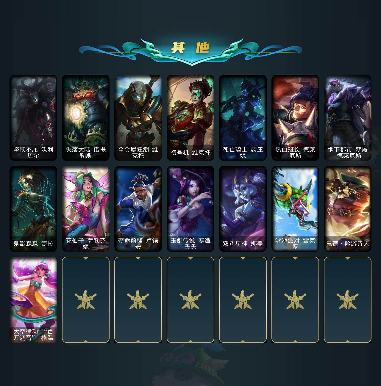 【限定皮肤】:冠军典狱长锤石,暗杀星蒙多,SSW辛吉德,SSW图奇,SSG霞,暗裔英雄盖伦,胜利剑圣易,胜利女神菲奥娜,魅惑女巫奈德丽,破空枪骑孙悟空,暗影沃里克,永恒之森乐芙兰,防暴天使凯尔,惊悚派对费德提克