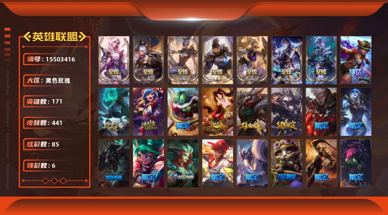[15503416]钻石段位-171英雄-441皮肤-85炫彩-0终极-11神话-77限定-48传说-87史诗