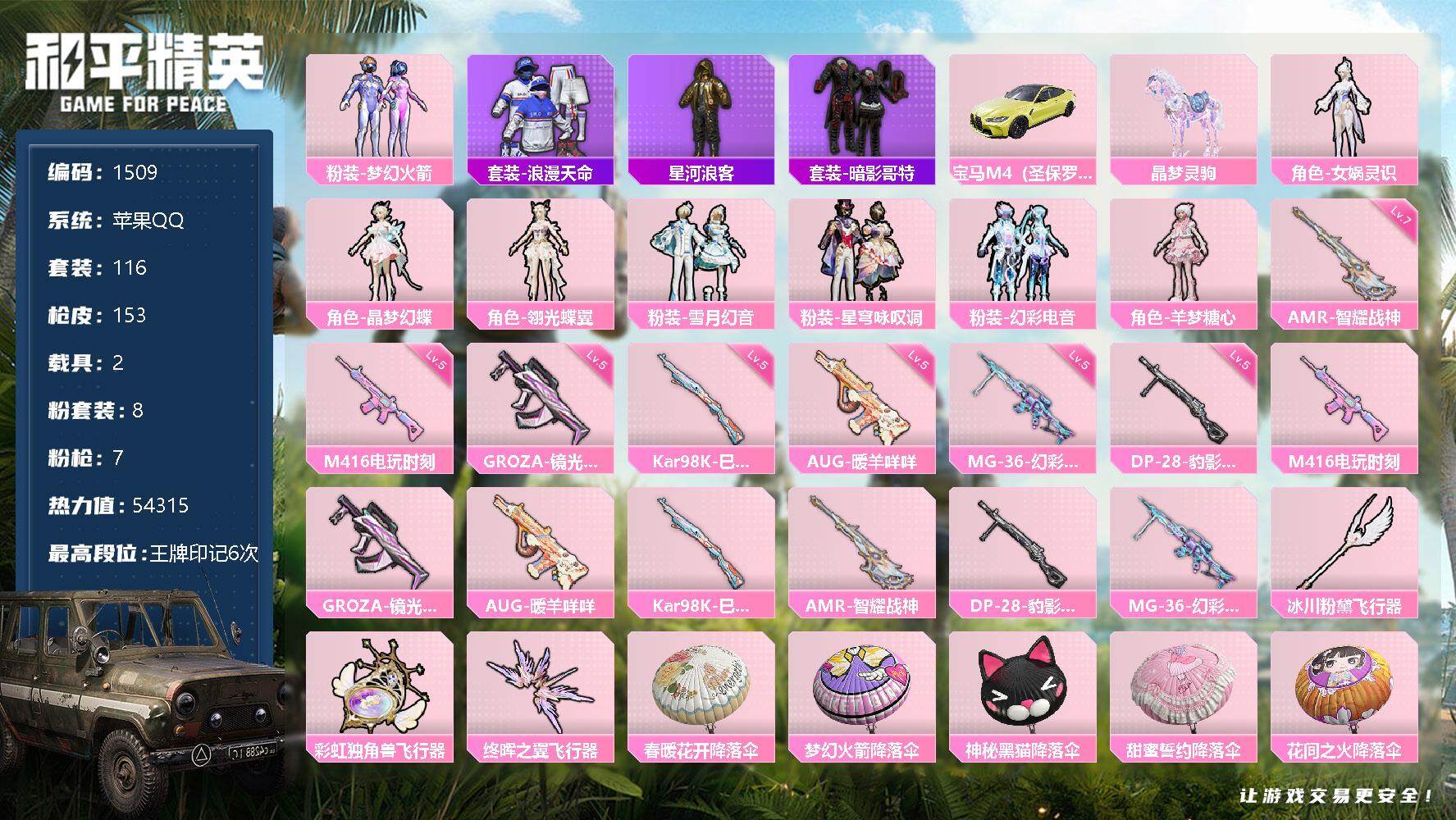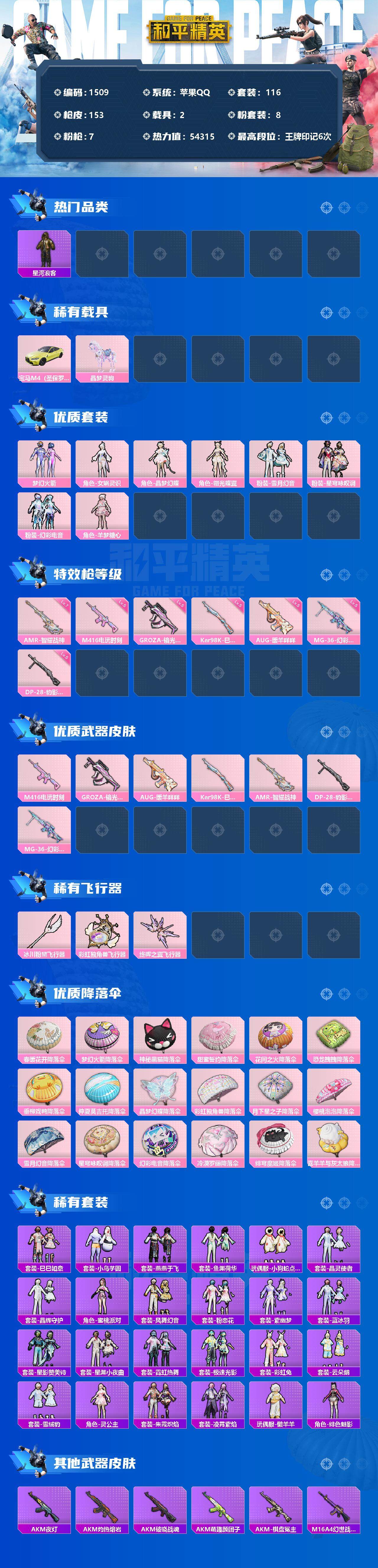 [13200749]【1509】苹果 手Q-8粉装-7特效枪-2载具-3粉色飞行器-54315热力值-6王牌印记-116套装-153枪皮