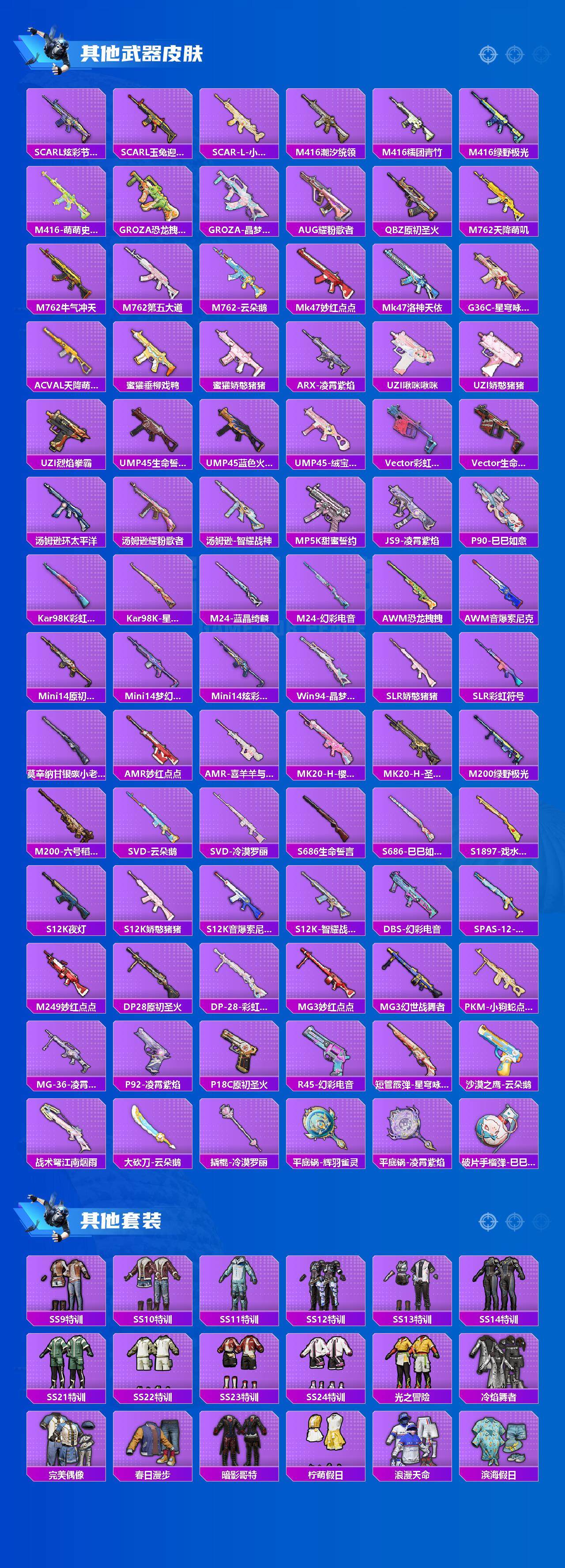 【稀有枪皮】:AKM-夜灯,AKM-灼热熔岩,AKM-破晓战魂,AKM-萌趣颜团子,AKM-棋盘冕主,M16A4-幻世战舞者,SCAR-L-炫彩节奏,SCAR-L-玉兔迎春,SCAR-L-小狗蛇点点,M416-潮汐统领,M416-糯团青竹,M416-绿野极光,M416-萌萌史莱姆,GROZA-恐龙拽拽,GROZA-晶梦幻蝶,AUG-耀粉歌者,QBZ-原初圣火,M762-天降萌叽,M762-牛气冲天,M762-第五大道,M762-云朵鹅,Mk47-妙红点