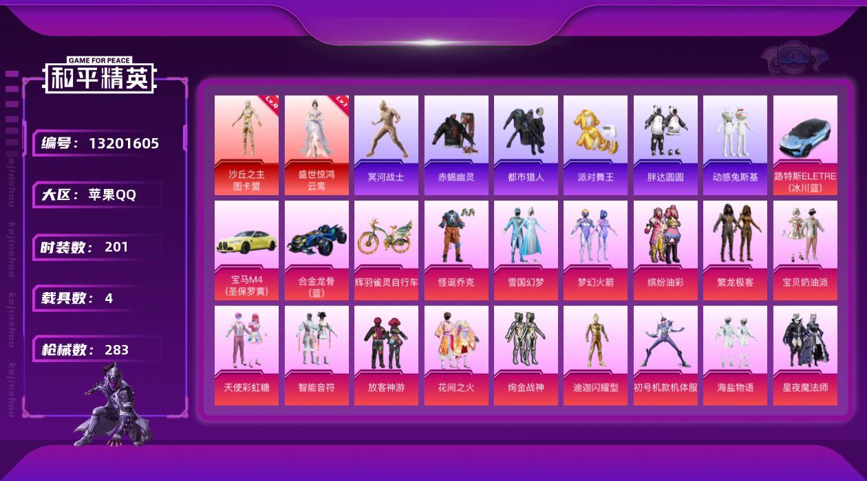[13201605]【1512】苹果 手Q-无敌战神框-2神装-23粉装-17特效枪-4载具-12粉色飞行器-108909热力值-19王牌印记-201套装-283枪皮 【红色神装等级】:盛世惊鸿-云鸾(一级),沙丘之主-图卡盟(四级) 【红色角色神装】:盛世惊鸿-云鸾,沙丘之主-图卡盟 【热门品类】:粉装-怪诞乔克,粉装-雪国幻梦,粉装-梦幻火箭,粉装-缤纷油彩,粉装-繁龙极客,套装-浪漫天命,套装-赤蝎幽灵,套装-都市猎人,套装-冥河战士,套装-派对舞王,套装-小丑鱼,套装-胖达圆圆,套装-动感兔斯基人偶服,套装-暗夜之虎,套装-龟仙人,套装-暗影哥特,套装-粉红小猪,角色-六号稻草人,小丑红鼻头 【粉色载具】:路特斯ELETRE(冰川蓝),宝马M4(圣保罗黄),合金龙骨(蓝),辉羽雀灵自行车 【粉色套装】:粉装-怪诞乔克,粉装-宝贝奶油派,粉装-天使彩虹糖,粉装-雪国幻梦,粉装-梦幻火箭,粉装-智能音符,粉装-缤纷油彩,粉装-放客神游,粉装-花间之火,粉装-绚金战神,角色-闪耀迪迦,角色-初号机款机体服,粉装-海盐物语,粉装-星夜魔法师,粉装-圣光天使,女娲后裔-赵灵儿,粉装-霞光圣骑,粉装-寒光使者,粉装-炫光之旅,粉装-繁龙极客,粉装-星穹咏叹调,角色-狂魅哈莉,角色-罗征 【粉色枪皮等级】:AKM-甜心宝贝(六级),AKM-梦之光华(一级),SCAR-L-梦幻火箭(五级),SCAR-L-金蛇镇世(六级),M416-心之恋语(三级),M416-至情至圣(六级),GROZA-焦糖拿铁(四级),AUG-超新星(四级),蜜獾-异瞳寒姬(一级),UMP45-相思残雪(四级),Vector-最终圣卫者(三级),P90-沙丘之主(三级),Kar98K-巳巳如意(五级),Mk14-盛世惊鸿(三级),AMR-智耀战神(一级),DP-28-豹影疾电(五级),MG3-辉羽雀灵(三级) 【粉色枪皮】:AKM-甜心宝贝,AKM-梦之光华,SCAR-L-梦幻火箭,SCAR-L-金蛇镇世,M416-心之恋语,M416-至情至圣,GROZA-焦糖拿铁,AUG-超新星,蜜獾-异瞳寒姬,UMP45-相思残雪,Vector-最终圣卫者,P90-沙丘之主,Kar98K-巳巳如意,Mk14-盛世惊鸿,AMR-智耀战神,DP-28-豹影疾电,MG3-辉羽雀灵 【粉色飞行器】:酣梦熊熊飞行器,梦幻火箭飞行器,星夜魔法师