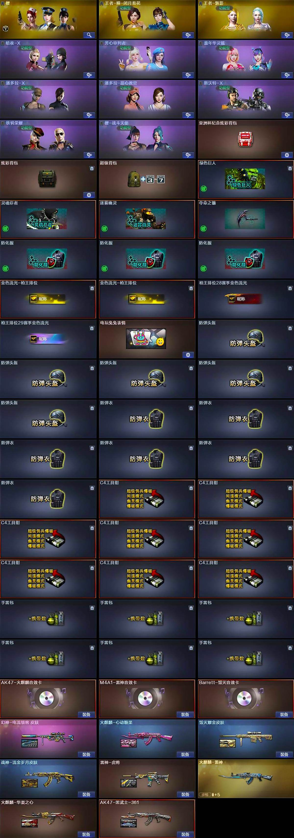 【道具】:亚洲杯纪念炫彩背包,炫彩背包,超级背包,绿色巨人,灵魂忍者,迷雾幽灵,夺命之镰,防化服*3,金色流光-枪王排位*2,枪王排位28赛季金色流光,枪王排位29赛季金色流光,电玩兔兔表情,防弹头盔*5,防弹衣*6,C4工具钳*8,手雷包*6