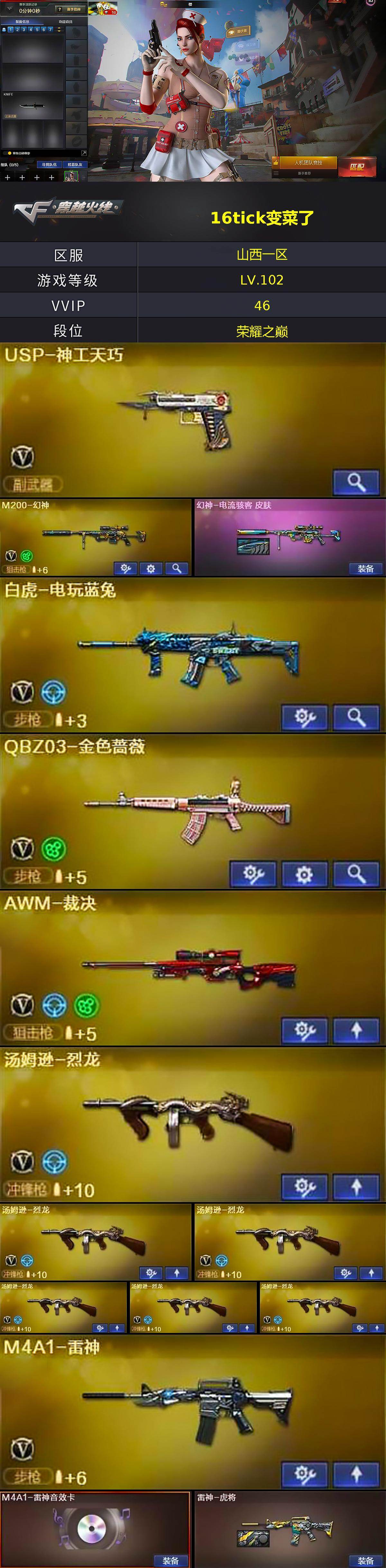 【热门武器】:QBZ03-金色蔷薇,HK417-朱雀,M200-幻神,白虎-电玩蓝兔,M4A1-黑骑士,汤姆逊-烈龙*6,沙鹰-修罗*5