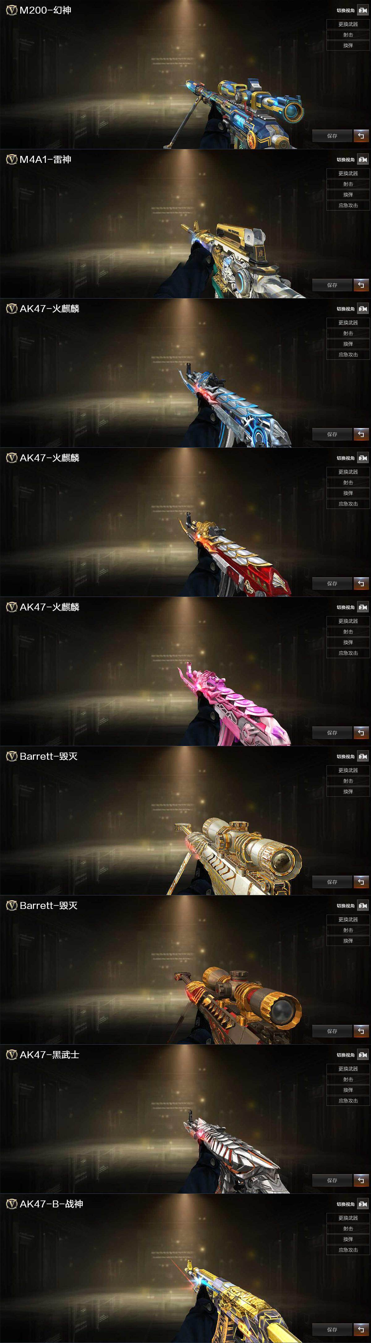 【英雄级武器】:AK47-火麒麟,M4A1-雷神,M4A1-黑骑士,AK12-天启,HK417-朱雀,M4A1-玫瑰精灵,QBZ03-金色蔷薇,AK47-B-战神,AK47-B-常胜将军,白虎-电玩蓝兔,Barrett-毁灭,AWM-裁决,M200-幻神,汤姆逊-烈龙*6,沙鹰-修罗*5,沙鹰-天神,USP-神工天巧,屠龙,擎天,麒麟刺,高爆手雷-幻灵,高爆手雷-竞技荣光,高爆手雷-云龙,闪光弹-幻灵,闪光弹-竞技荣光,闪光弹-神工天巧,烟雾弹-竞技荣光,烟雾弹-神工天巧