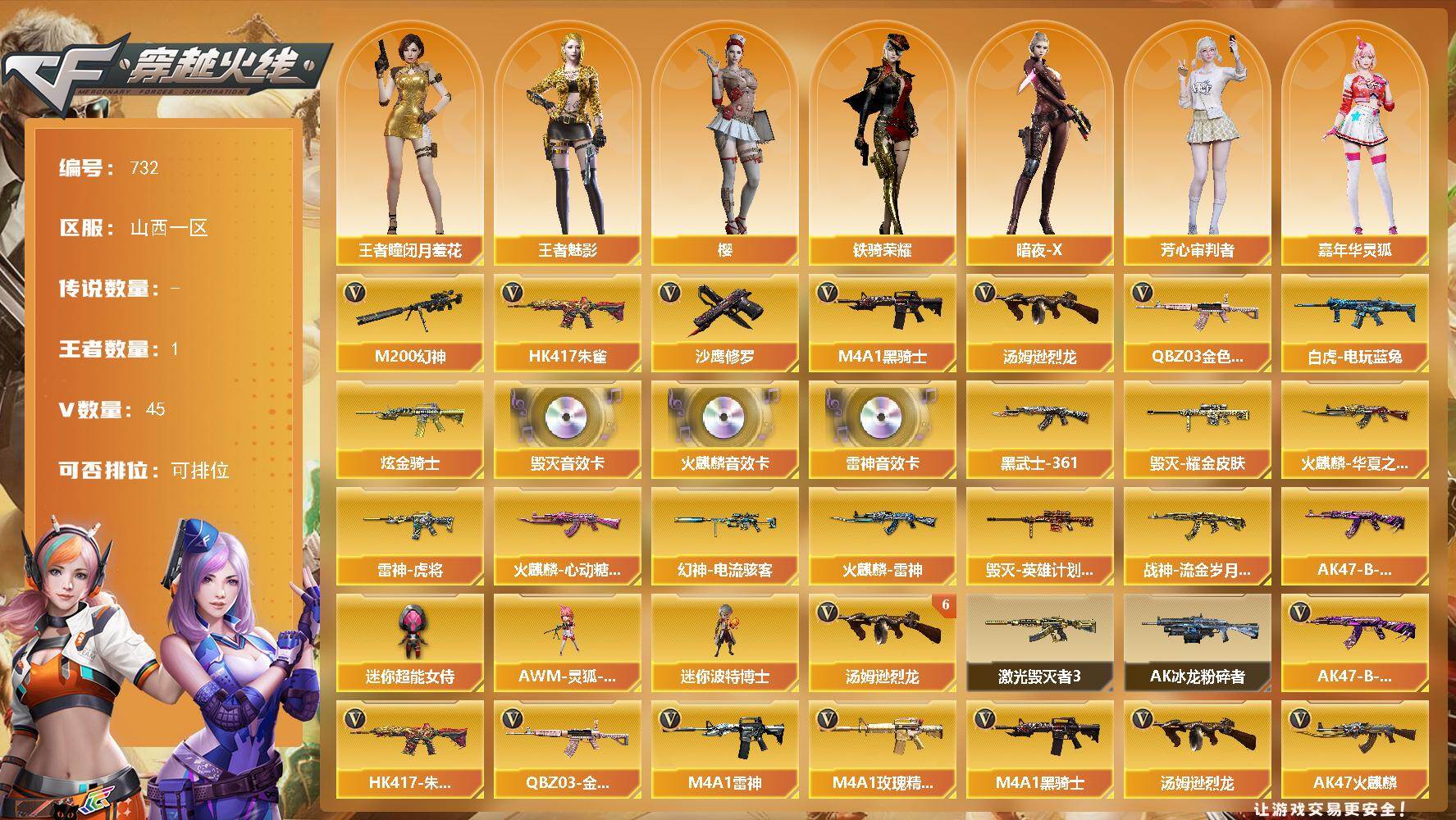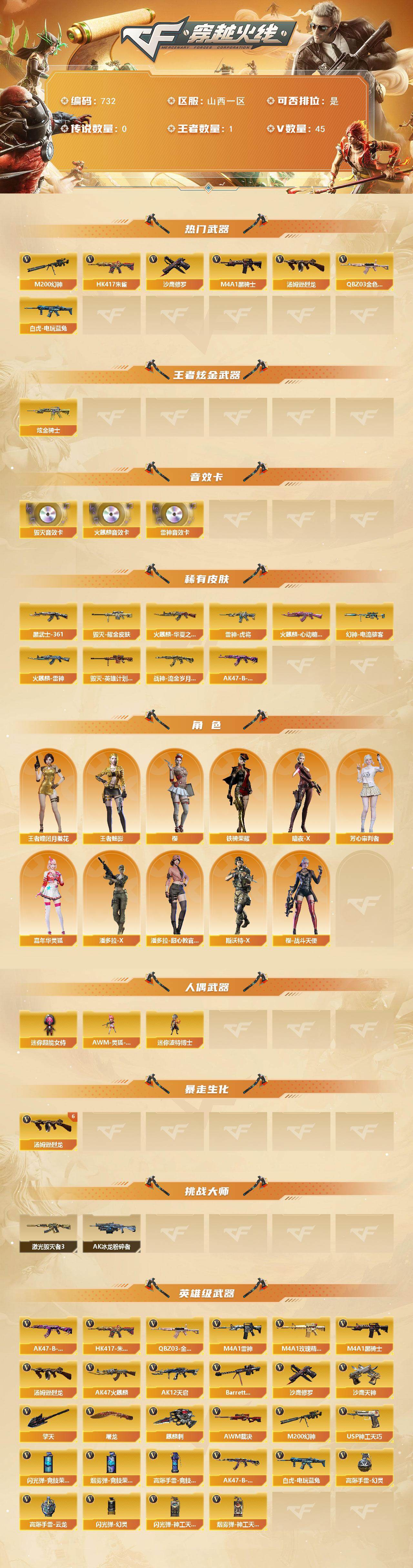 [15427610]山西一区-45V-1王者-1炫金 【热门武器】:QBZ03-金色蔷薇,HK417-朱雀,M200-幻神,白虎-电玩蓝兔,M4A1-黑骑士,汤姆逊-烈龙*6,沙鹰-修罗*5 【王者炫金武器】:炫金骑士 【音效卡】:AK47-火麒麟音效卡,M4A1-雷神音效卡,Barrett-毁灭音效卡 【皮肤】:幻神-电流骇客 皮肤,雷神-虎将,火麒麟-雷神,火麒麟-华夏之心,火麒麟-心动糖果,毁灭耀金皮肤,毁灭-英雄计划 皮肤,AK47-黑武士-361,战神-流金岁月皮肤,AK47-B-常胜将军-曹操 【角色】:樱,王者-瞳-闭月羞花,王者-魅影,暗夜-X,芳心审判者,嘉年华灵狐,潘多拉-X,潘多拉-甜心教官,斯沃特-X,铁骑荣耀,樱-战斗天使 【人偶武器】:AWM-灵狐-15周年嘉年华,迷你波特博士,迷你超能女侍 【挑战大师】:AK47-冰龙粉碎者,激光毁灭者III 【英雄级武器】:AK47-火麒麟,M4A1-雷神,M4A1-黑骑士,AK12-天启,HK417-朱雀,M4A1-玫瑰精灵,QBZ03-金色蔷薇,AK47-B-战神,AK47-B-常胜将军,白虎-电玩蓝兔,Barrett-毁灭,AWM-裁决,M200-幻神,汤姆逊-烈龙*6,沙鹰-修罗*5,沙鹰-天神,USP-神工天巧,屠龙,擎天,麒麟刺,高爆手雷-幻灵,高爆手雷-竞技荣光,高爆手雷-云龙,闪光弹-幻灵,闪光弹-竞技荣光,闪光弹-神工天巧,烟雾弹-竞技荣光,烟雾弹-神工天巧 【道具】:亚洲杯纪念炫彩背包,炫彩背包,超级背包,绿色巨人,灵魂忍者,迷雾幽灵,夺命之镰,防化服*3,金色流光-枪王排位*2,枪王排位28赛季金色流光,枪王排位29赛季金色流光,电玩兔兔表情,防弹头盔*5,防弹衣*6,C4工具钳*8,手雷包*6 【特殊枪械】:1黑骑士,6烈龙