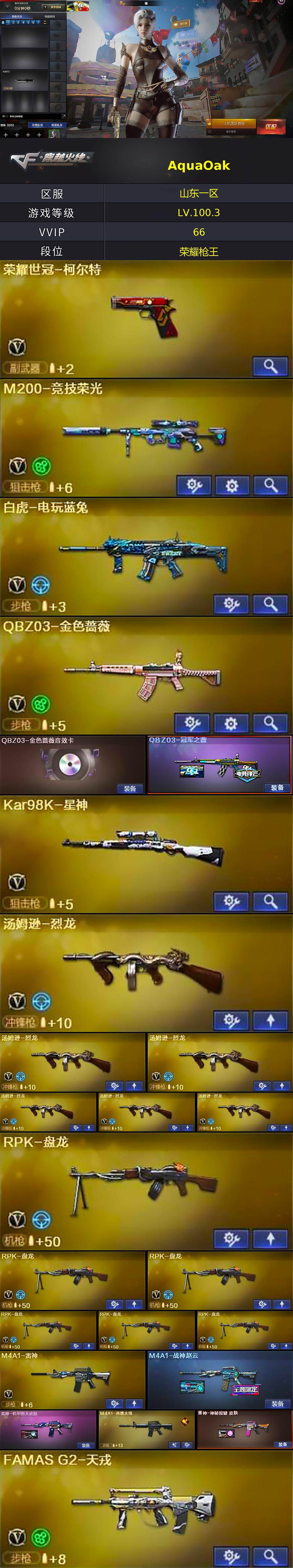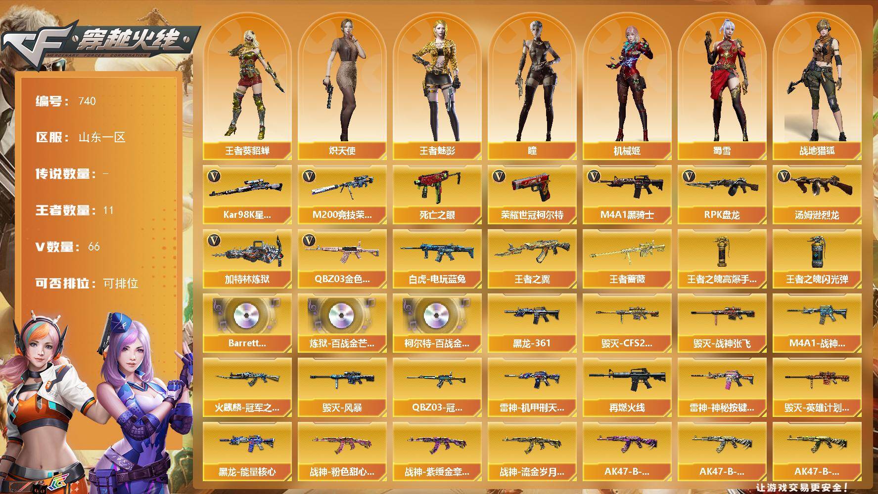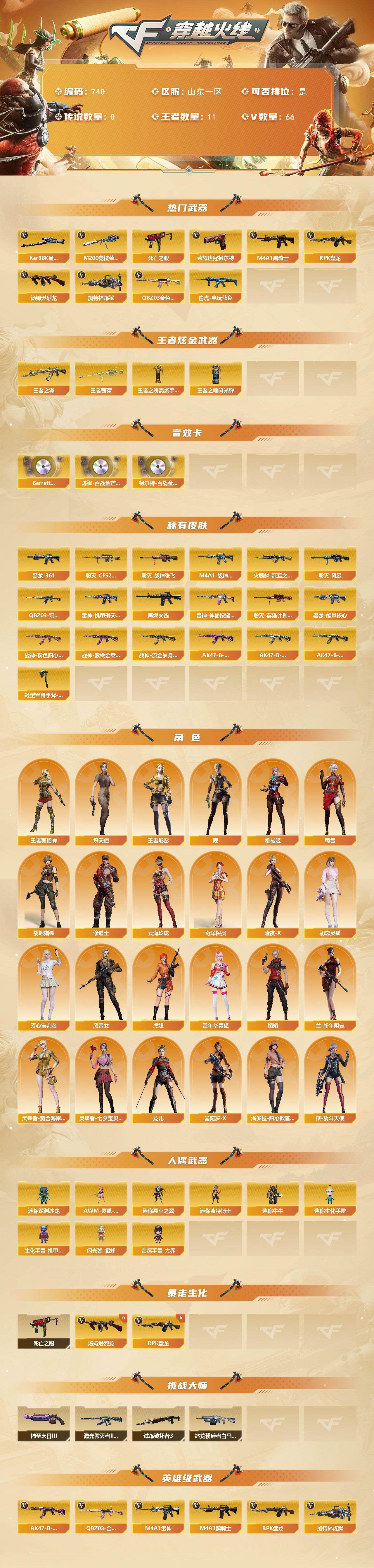 [15347943]山东一区-66V-11王者-0炫金 【热门武器】:QBZ03-金色蔷薇,M200-竞技荣光,死亡之眼,白虎-电玩蓝兔,荣耀世冠-柯尔特,Kar98K-星神,M4A1-黑骑士*4,汤姆逊-烈龙*6,RPK-盘龙*6,加特林-炼狱 【王者炫金武器】:王者之翼,王者蔷薇,王者之魄高爆手雷*2,王者之魄闪光弹*2 【音效卡】:Barrett-碧霄极光音效卡,炼狱-百战金芒-庆典舞曲音效卡,柯尔特-百战金芒-庆典舞曲音效卡 【皮肤】:QBZ03-冠军之薇,M4A1-战神赵云,雷神-机甲刑天皮肤,M4A1-再燃火线,雷神-神秘按键 皮肤,火麒麟-冠军之心,毁灭-CFS2020,毁灭-战神张飞,毁灭-风暴,毁灭-英雄计划 皮肤,黑龙-能量核心,M4A1-黑龙-361,战神-粉色甜心皮肤*2,战神-紫绶金章皮肤,战神-流金岁月皮肤,AK47-B-常胜将军-曹操*2,AK47-B-常胜将军-刘备,AK47-B-常胜将军-孙权*2,轻型军用手斧-再燃火线 【角色】:瞳,机械姬,战地猎狐,王者-葵-貂蝉,王者-魅影,奇洋探员,修道士,云海玲珑,炽天使,暗夜-X,初恋灵狐,芳心审判者,风暴女,虎妞,嘉年华灵狐,娟娟,兰-新年限定,灵狐者-黄金海岸,灵狐者-七夕宝贝,龙儿,曼陀罗-X,潘多拉-甜心教官,蜀雪,樱-战斗天使 【人偶武器】:AWM-灵狐-15周年嘉年华*2,迷你深渊冰龙,迷你裂空之翼*2,迷你波特博士*2,迷你牛牛*2,迷你生化手雷,生化手雷-机甲核心*2,闪光弹-貂蝉,高爆手雷-大乔 【暴走生化】:死亡之眼 【挑战大师】:冰龙粉碎者-白马银枪*2,激光毁灭者III-白马银枪*2,试炼破坏者III,神圣爆裂者-末日III 【英雄级武器】:AK47-火麒麟,M4A1-雷神,M4A1-黑骑士*4,QBZ03-天罚,无影-神兵利器,FAMAS G2-天戎,QBZ03-金色蔷薇,M4A1-猎神,AK-47-猩红传说*2,AK47-B-战神,AK47-B-常胜将军,白虎-电玩蓝兔,王者猎神-觉醒版,AWM-天龙,Barrett-毁灭,Barrett-朱雀,Kar98K-星神,M200-竞技荣光,RPK-盘龙*6,加特林-炼狱,炼狱-百战金芒,汤姆逊-烈龙*6,沙鹰-天神*3,荣耀世冠-柯尔特,屠龙,擎天-竞技荣光,麒麟刺-百战金芒,王者之锋-觉醒版,王者之啸-觉醒版,王者之击-觉醒版*2