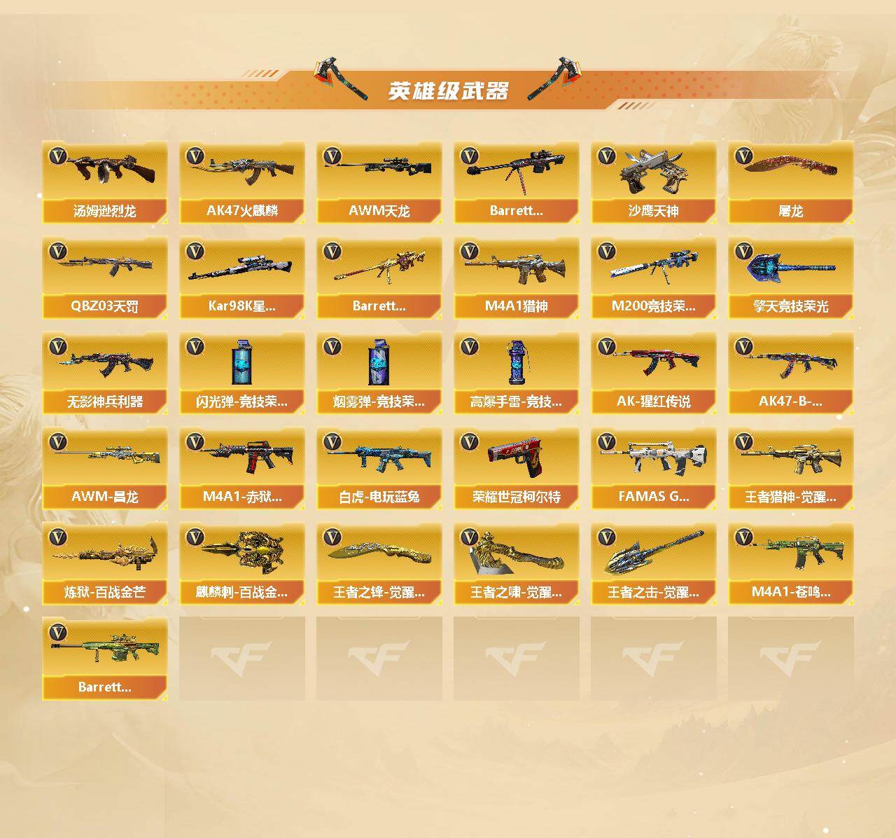 【英雄级武器】:AK47-火麒麟,M4A1-雷神,M4A1-黑骑士*4,QBZ03-天罚,无影-神兵利器,FAMAS G2-天戎,QBZ03-金色蔷薇,M4A1-猎神,AK-47-猩红传说*2,AK47-B-战神,AK47-B-常胜将军,白虎-电玩蓝兔,王者猎神-觉醒版,AWM-天龙,Barrett-毁灭,Barrett-朱雀,Kar98K-星神,M200-竞技荣光,RPK-盘龙*6,加特林-炼狱,炼狱-百战金芒,汤姆逊-烈龙*6,沙鹰-天神*3,荣耀世冠-柯尔特,屠龙,擎天-竞技荣光,麒麟刺-百战金芒,王者之锋-觉醒版,王者之啸-觉醒版,王者之击-觉醒版*2