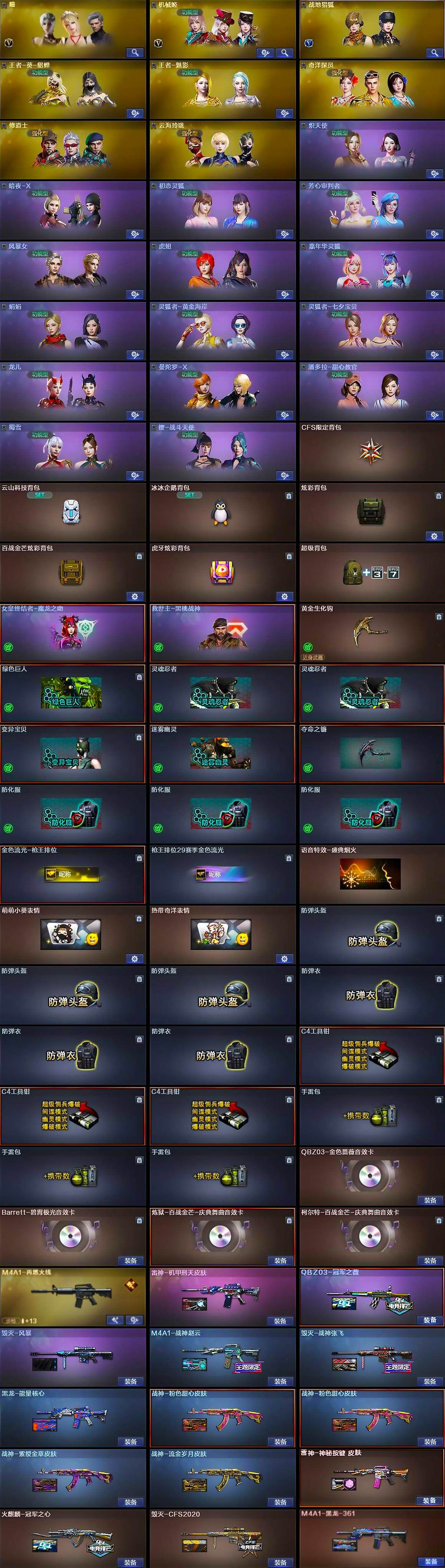 【皮肤】:QBZ03-冠军之薇,M4A1-战神赵云,雷神-机甲刑天皮肤,M4A1-再燃火线,雷神-神秘按键 皮肤,火麒麟-冠军之心,毁灭-CFS2020,毁灭-战神张飞,毁灭-风暴,毁灭-英雄计划 皮肤,黑龙-能量核心,M4A1-黑龙-361,战神-粉色甜心皮肤*2,战神-紫绶金章皮肤,战神-流金岁月皮肤,AK47-B-常胜将军-曹操*2,AK47-B-常胜将军-刘备,AK47-B-常胜将军-孙权*2,轻型军用手斧-再燃火线