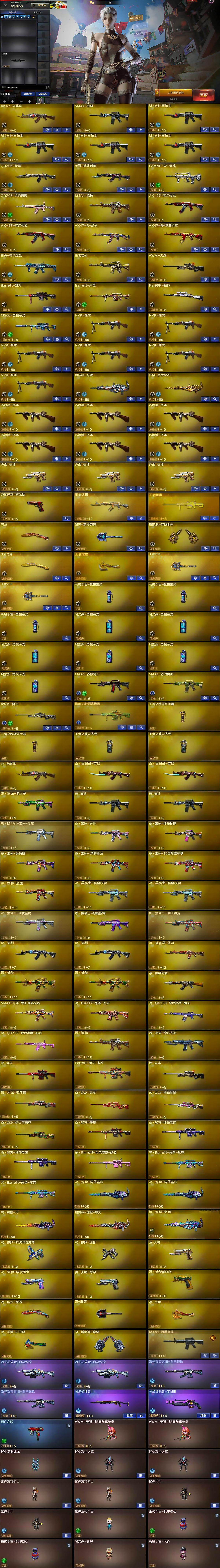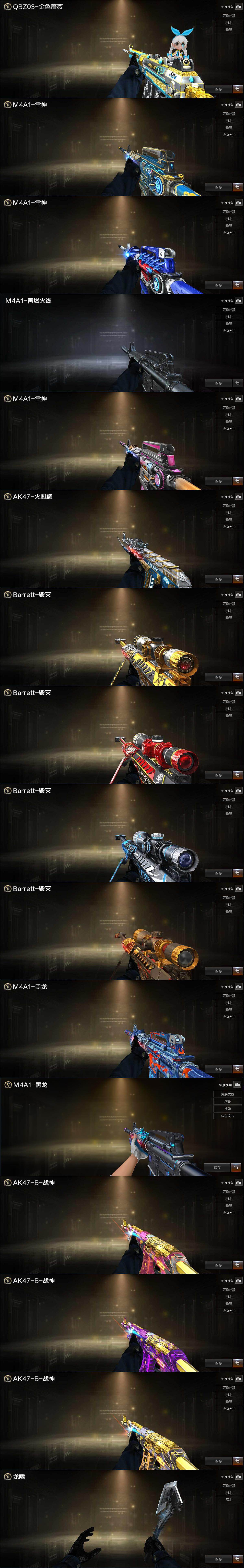 【热门武器】:QBZ03-金色蔷薇,M200-竞技荣光,死亡之眼,白虎-电玩蓝兔,荣耀世冠-柯尔特,Kar98K-星神,M4A1-黑骑士*4,汤姆逊-烈龙*6,RPK-盘龙*6,加特林-炼狱