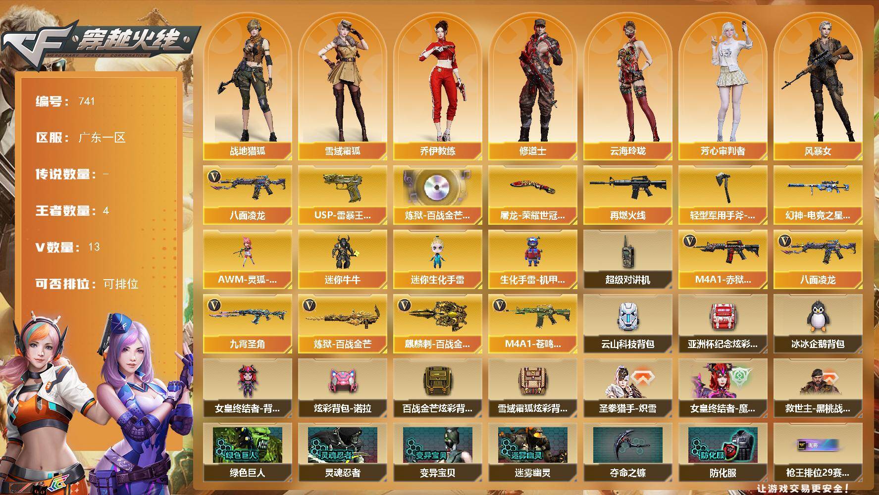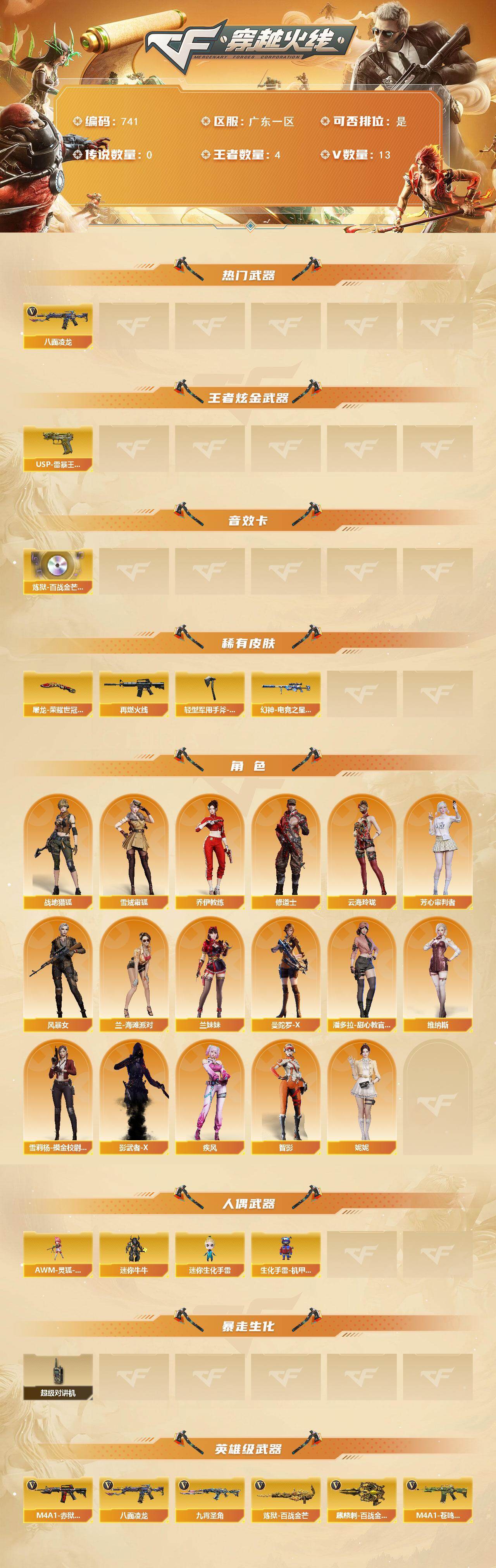 [15428991]广东一区-13V-4王者-0炫金 【热门武器】:八面凌龙 【王者炫金武器】:USP-雷暴王者 【音效卡】:炼狱-百战金芒-庆典舞曲音效卡 【皮肤】:幻神-电竞之星 皮肤,M4A1-再燃火线,屠龙-荣耀世冠AG,轻型军用手斧-再燃火线 【角色】:妮妮,战地猎狐,雪域霜狐,乔伊教练,修道士,云海玲珑,芳心审判者,风暴女,疾风,兰-海滩派对,兰妹妹,曼陀罗-X,潘多拉-甜心教官,维纳斯,雪莉杨-摸金校尉,影武者-X,智影 【人偶武器】:AWM-灵狐-15周年嘉年华,迷你牛牛,迷你生化手雷*2,生化手雷-机甲核心 【暴走生化】:超级对讲机 【英雄级武器】:八面凌龙,九霄圣角,炼狱-百战金芒,麒麟刺-百战金芒,M4A1-赤狱骑士,M4A1-苍鸣雷神 【道具】:云山科技背包,亚洲杯纪念炫彩背包,冰冰企鹅背包,女皇终结者-背包,炫彩背包-诺拉,百战金芒炫彩背包,雪域霜狐炫彩背包,圣拳猎手-炽雪,女皇终结者-魔龙之吻,救世主-黑桃战神,绿色巨人,灵魂忍者*2,变异宝贝,迷雾幽灵*2,夺命之镰,防化服*3,枪王排位29赛季金色流光,语音特效-盛典烟火,语音特效-怀旧,雪域霜狐表情,萌萌小葵表情,EP战队击杀图标,防弹头盔*3,防弹衣*3,C4工具钳*3,手雷包*3 【特殊枪械】: