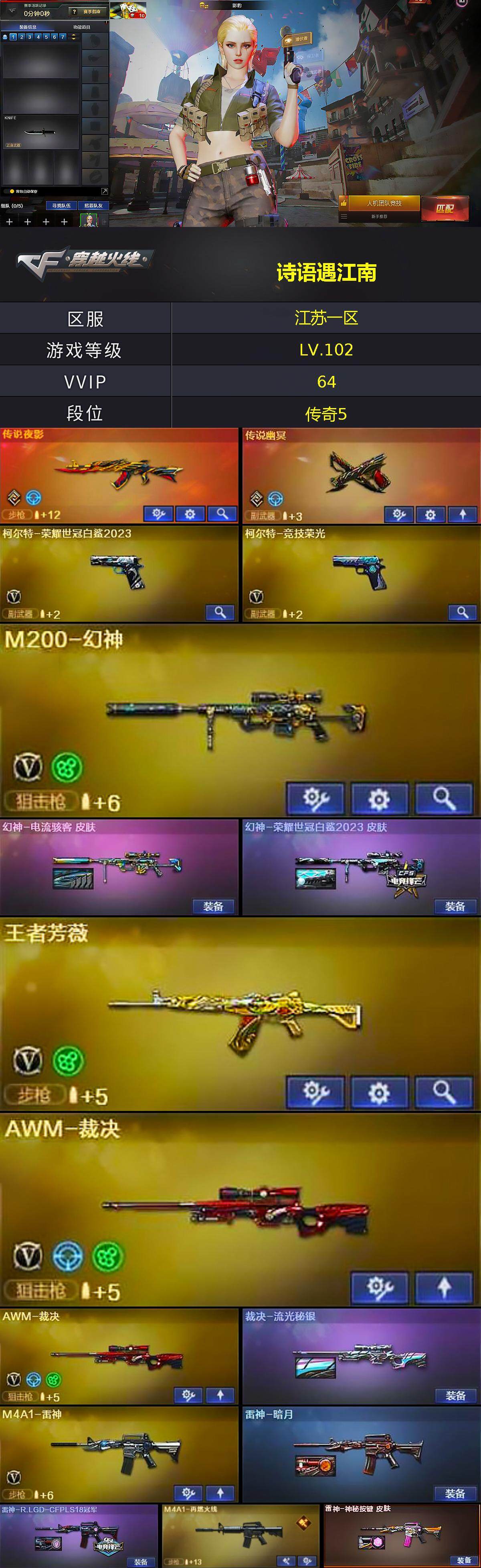 [15248115]江苏一区-56V-4王者-0炫金 【传说武器】:传说夜影,传说幽冥 【热门武器】:传说夜影,传说幽冥,M14EBR-玄武,M200-幻神,柯尔特-荣耀世冠白鲨2023,羊驼玩偶 【王者炫金武器】:王者星光 【音效卡】:炼狱-百战金芒-庆典舞曲音效卡 【皮肤】:幻神-电流骇客 皮肤,幻神-荣耀世冠白鲨2023 皮肤,裁决-流光秘银,雷神-暗月,雷神-R.LGD-CFPLS18冠军,M4A1-再燃火线,雷神-神秘按键 皮肤,火麒麟-百城,天启-暗月,AWM-天龙-传奇白鲨,屠龙-荣耀之锋,屠龙-春桃 皮肤*2,轻型军用手斧-再燃火线,擎天-冠军之击,麒麟刺-月皮肤 【角色】:影豹,隼,司雨,王者岚兮儿,蛇隐宗,暗夜-X,灵狐-花神,潘多拉-甜心教官,蛇姬,铁骑荣耀,夜玫瑰-幻能朋克,影武者-X 【人偶武器】:迷你深渊冰龙 【挑战大师】:激光毁灭者III-白马银枪 【英雄级武器】:AK47-火麒麟,M4A1-雷神,AK12-天启,AN94-超新星,AK47-黑鲨,M4A1-龙血,M14EBR-玄武,王者芳薇-觉醒版,AWM-裁决*2,M200-幻神,王者之怒-觉醒版,炼狱-百战金芒,炼狱-悦蓝-觉醒版,AA-12-雷霆,沙鹰-天神*3,柯尔特-荣耀世冠白鲨2023,柯尔特-竞技荣光,屠龙*3,龙啸*2,擎天,麒麟刺,幻灵之锋,擎天-竞技荣光,麒麟刺-百战金芒,高爆手雷-幻灵*7,高爆手雷-竞技荣光*2,高爆手雷-古蛇迷踪,闪光弹-幻灵*3,闪光弹-竞技荣光*3,烟雾弹-幻灵*4,烟雾弹-竞技荣光,烟雾弹-古蛇迷踪,M4A1-赤狱骑士 【道具】:CFS限定背包,冰冰企鹅背包-猛男专用,次元之矛-黄金背包,炫彩背包,百战金芒炫彩背包,超级背包,女皇终结者-魔龙之吻,绿色巨人,灵魂忍者*2,迷雾幽灵*2,夺命之镰,防化服*2,金色流光-枪王排位,星辰流光-枪王排位,流光-鎏金之域,枪王排位28赛季金色流光,枪王排位29赛季金色流光,语音特效-盛典烟火,热带奇洋打击特效,蛇隐宗表情,萌萌小葵表情,电玩兔兔表情,防弹头盔*2,防弹衣*2,C4工具钳*2,手雷包*2 【特殊枪械】:
