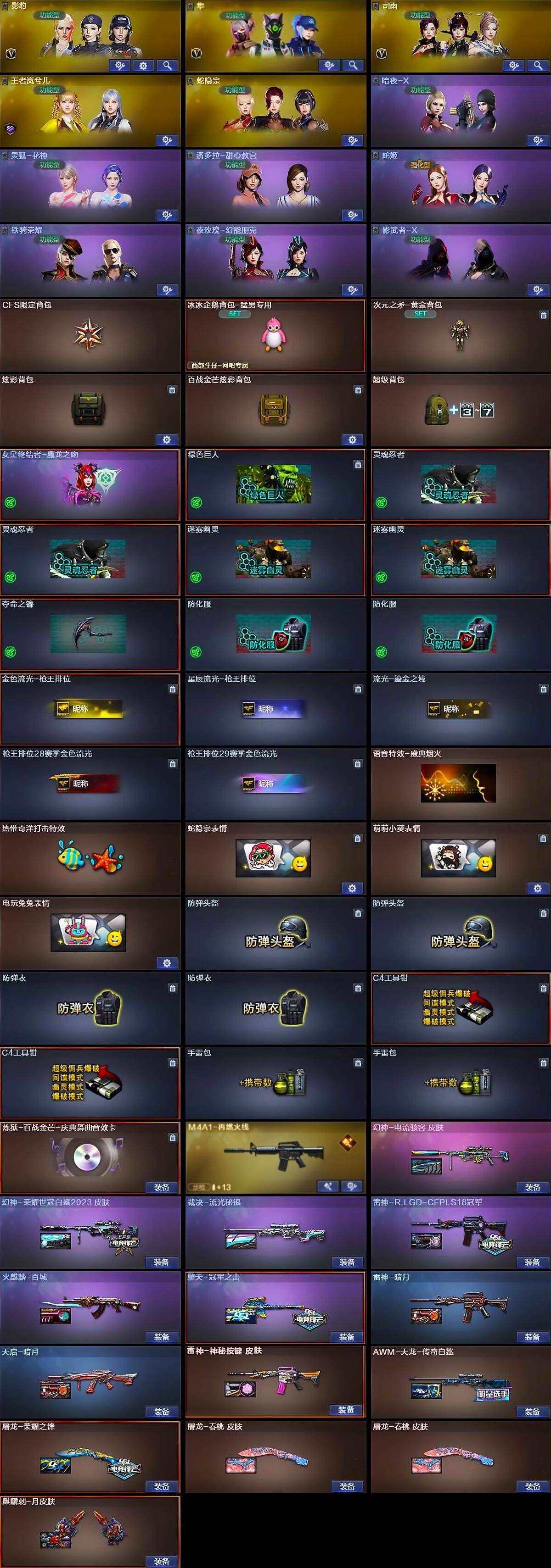【道具】:CFS限定背包,冰冰企鹅背包-猛男专用,次元之矛-黄金背包,炫彩背包,百战金芒炫彩背包,超级背包,女皇终结者-魔龙之吻,绿色巨人,灵魂忍者*2,迷雾幽灵*2,夺命之镰,防化服*2,金色流光-枪王排位,星辰流光-枪王排位,流光-鎏金之域,枪王排位28赛季金色流光,枪王排位29赛季金色流光,语音特效-盛典烟火,热带奇洋打击特效,蛇隐宗表情,萌萌小葵表情,电玩兔兔表情,防弹头盔*2,防弹衣*2,C4工具钳*2,手雷包*2