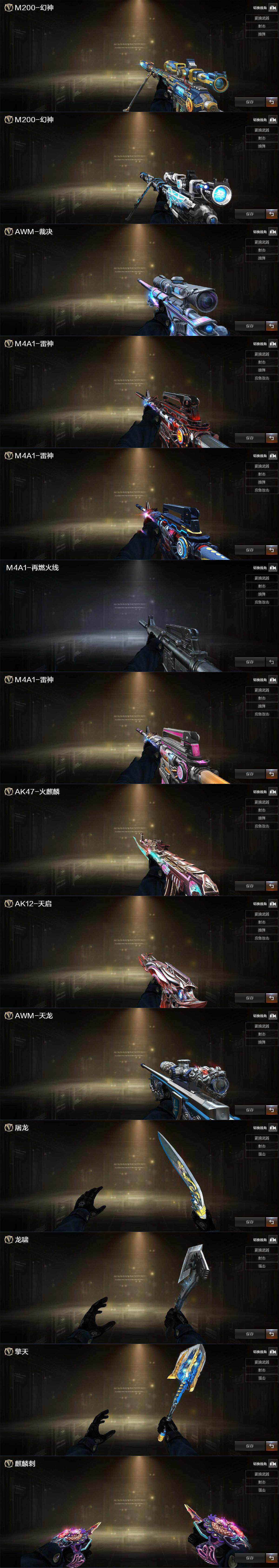 【皮肤】:幻神-电流骇客 皮肤,幻神-荣耀世冠白鲨2023 皮肤,裁决-流光秘银,雷神-暗月,雷神-R.LGD-CFPLS18冠军,M4A1-再燃火线,雷神-神秘按键 皮肤,火麒麟-百城,天启-暗月,AWM-天龙-传奇白鲨,屠龙-荣耀之锋,屠龙-春桃 皮肤*2,轻型军用手斧-再燃火线,擎天-冠军之击,麒麟刺-月皮肤