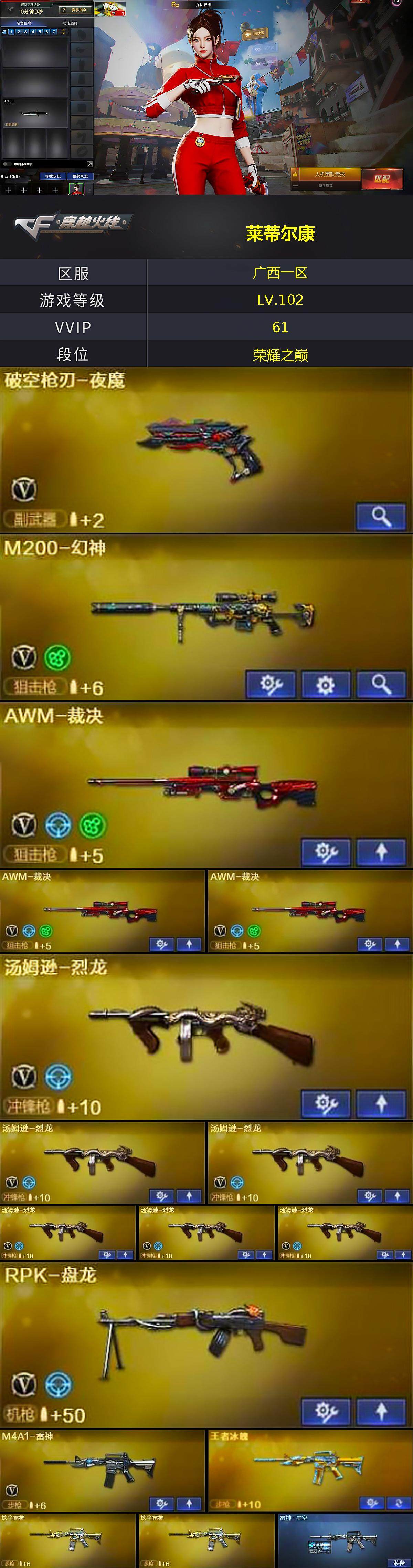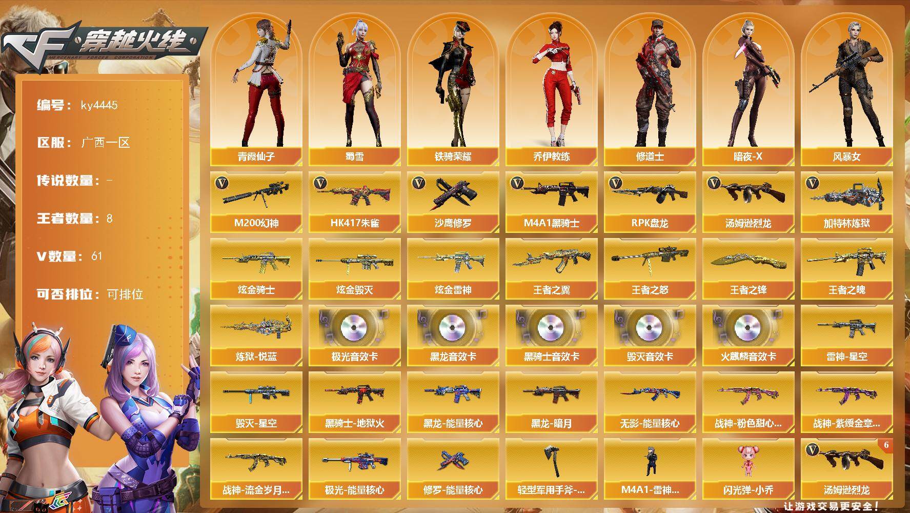 [15248126]广西一区-61V-8王者-4炫金 【热门武器】:HK417-朱雀,M200-幻神,M4A1-黑骑士,汤姆逊-烈龙*6,RPK-盘龙,加特林-炼狱,沙鹰-修罗 【王者炫金武器】:王者之翼*2,王者之魄,王者之怒,炼狱-悦蓝*2,王者之锋,炫金骑士,炫金雷神*2,炫金毁灭 【音效卡】:AK47-火麒麟音效卡,M4A1-黑龙音效卡*2,M4A1-黑骑士音效卡,Barrett-毁灭音效卡,Barrett-极光音效卡 【皮肤】:雷神-星空,毁灭-星空,黑龙-能量核心,黑龙-暗月,黑骑士-地狱火,无影-能量核心,战神-粉色甜心皮肤,战神-紫绶金章皮肤,战神-流金岁月皮肤,极光-能量核心,修罗-能量核心,轻型军用手斧-再燃火线 【角色】:乔伊教练,修道士,暗夜-X,风暴女,兰妹妹,灵狐者-黄金海岸,龙儿,潘多拉-甜心教官,潜龙队-X,青霞仙子,蜀雪,铁骑荣耀,雪莉杨,影武者-X 【人偶武器】:M4A1-雷神-精英刀锋,闪光弹-小乔 【挑战大师】:激光毁灭者III 【英雄级武器】:M4A1-千变,AK47-火麒麟*2,M4A1-黑龙*3,M4A1-雷神,M4A1-黑骑士,AK47-无影*2,AK47-黑武士*3,AK12-天启*5,AK47-黑鲨*2,HK417-朱雀,AK-47-猩红传说,AK47-B-战神,AWM-天龙,Barrett-毁灭*3,Barrett-极光,AWM-裁决*3,M200-幻神,RPK-盘龙,加特林-炼狱,汤姆逊-烈龙*6,沙鹰-修罗,沙鹰-天神,破空枪刃-夜魔,屠龙*3,马来剑-夜魔,擎天*2,王者之击-觉醒版,高爆手雷-夜魔*2,闪光弹-夜魔*2,烟雾弹-夜魔*2 【道具】:CFS限定背包,云山科技背包,超级背包,救世主-黑桃战神,绿色巨人,灵魂忍者,迷雾幽灵,生化弹匣,夺命之镰,防化服*3,防弹头盔*6,防弹衣*6,C4工具钳*4,手雷包*5 【特殊枪械】:1黑骑士,6烈龙,1盘龙,1炼狱