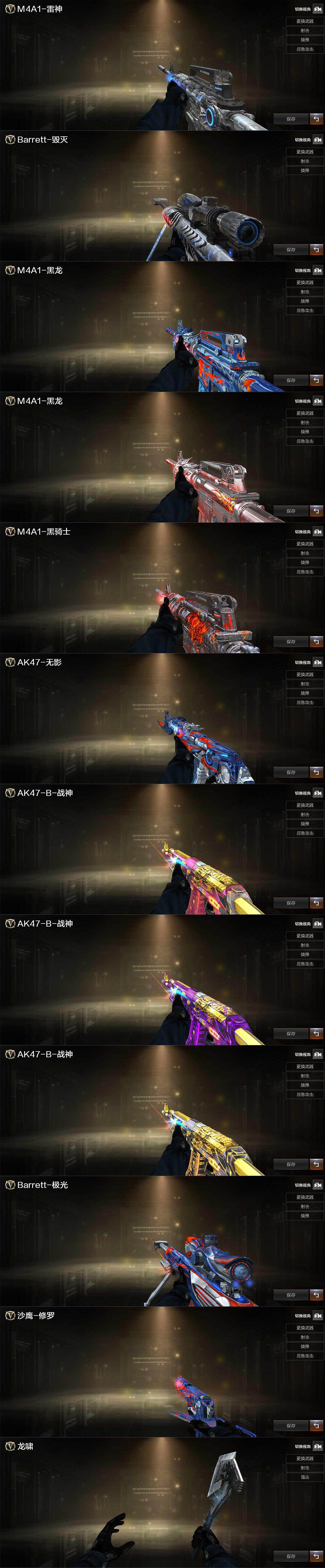 【英雄级武器】:M4A1-千变,AK47-火麒麟*2,M4A1-黑龙*3,M4A1-雷神,M4A1-黑骑士,AK47-无影*2,AK47-黑武士*3,AK12-天启*5,AK47-黑鲨*2,HK417-朱雀,AK-47-猩红传说,AK47-B-战神,AWM-天龙,Barrett-毁灭*3,Barrett-极光,AWM-裁决*3,M200-幻神,RPK-盘龙,加特林-炼狱,汤姆逊-烈龙*6,沙鹰-修罗,沙鹰-天神,破空枪刃-夜魔,屠龙*3,马来剑-夜魔,擎天*2,王者之击-觉醒版,高爆手雷-夜魔*2,闪光弹-夜魔*2,烟雾弹-夜魔*2