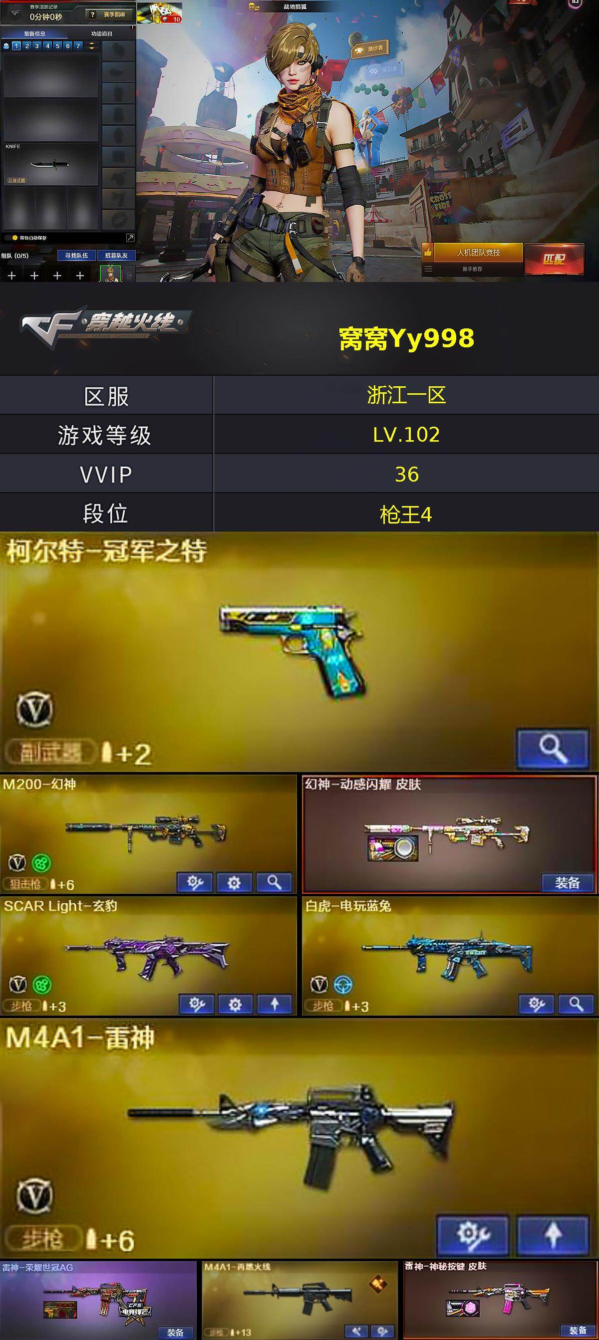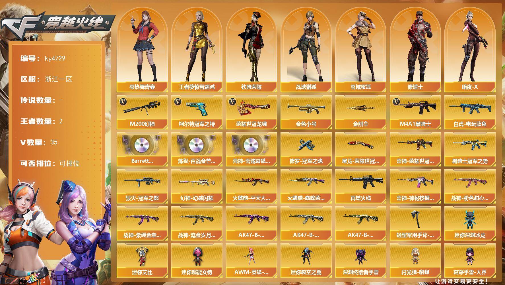 [15386624]浙江一区-35V-2王者-0炫金 【热门武器】:M200-幻神,白虎-电玩蓝兔,柯尔特-冠军之特,金色小号,M4A1-黑骑士,荣耀世冠-龙啸,金刚伞 【音效卡】:Barrett-碧霄极光音效卡,炼狱-百战金芒-庆典舞曲音效卡,死神-雪域霜狐-怀旧音效卡 【皮肤】:幻神-动感闪耀 皮肤,雷神-荣耀世冠AG,M4A1-再燃火线,雷神-神秘按键 皮肤,火麒麟-平天大圣,火麒麟-巅峰荣耀,毁灭-冠军之怒,黑骑士-冠军之势,战神-粉色甜心皮肤,战神-紫绶金章皮肤,战神-流金岁月皮肤,AK47-B-常胜将军-曹操*3,AK47-B-常胜将军-刘备,AK47-B-常胜将军-孙权*2,修罗-冠军之魂,屠龙-荣耀世冠AG,轻型军用手斧-再燃火线 【角色】:战地猎狐,王者葵-惊若翩鸿,雪域霜狐,修道士,暗夜-X,初恋灵狐,芳心审判者,虎妞,嘉年华灵狐,零-热舞青春,灵狐者-七夕宝贝,龙儿-小淘气,潘多拉-X,潘多拉-甜心教官,斯沃特-X,铁骑荣耀,兔囡囡,新娜塔莎 【人偶武器】:AWM-灵狐-15周年嘉年华,迷你深渊冰龙,迷你裂空之翼,深渊终结者手雷,闪光弹-貂蝉,高爆手雷-大乔,迷你艾比,迷你超能女侍 【暴走生化】:超级对讲机 【挑战大师】:冰龙粉碎者-白马银枪*2,激光毁灭者III-白马银枪*3,激光毁灭者III 【英雄级武器】:AK47-火麒麟,M4A1-雷神,M4A1-黑骑士,M4A1-死神,无影-神兵利器,死神-雪域霜狐,SCAR Light-玄豹,AK47-B-常胜将军,白虎-电玩蓝兔,Barrett-毁灭,M200-幻神,炼狱-百战金芒,柯尔特-冠军之特,屠龙*2,龙啸,麒麟刺,荣耀世冠-龙啸,麒麟刺-百战金芒,王者之锋-觉醒版,王者之击-觉醒版,丛林匕首-玄豹,高爆手雷-玄豹,闪光弹-玄豹,烟雾弹-玄豹*2,M4A1-赤狱骑士,AWM-昌龙,Barrett-碧霄极光 【道具】:AG战队炫彩背包,BS战队炫彩背包,CFS限定背包,EP战队炫彩背包,Q9战队炫彩背包,云山科技背包,亚洲杯纪念炫彩背包,炫彩背包-诺拉,炫彩背包,百战金芒炫彩背包,超级背包,雪域霜狐炫彩背包,黑桃战神背包,女皇终结者-魔龙之吻,救世主-黑桃战神,黄金生化钩*2,绿色巨人,灵魂忍者*2,变异宝贝,妖姬,迷雾幽灵*2,生化弹匣,夺命之镰,防化服*3,金色流光-枪王排位,流光-鎏金之域,枪王排位29