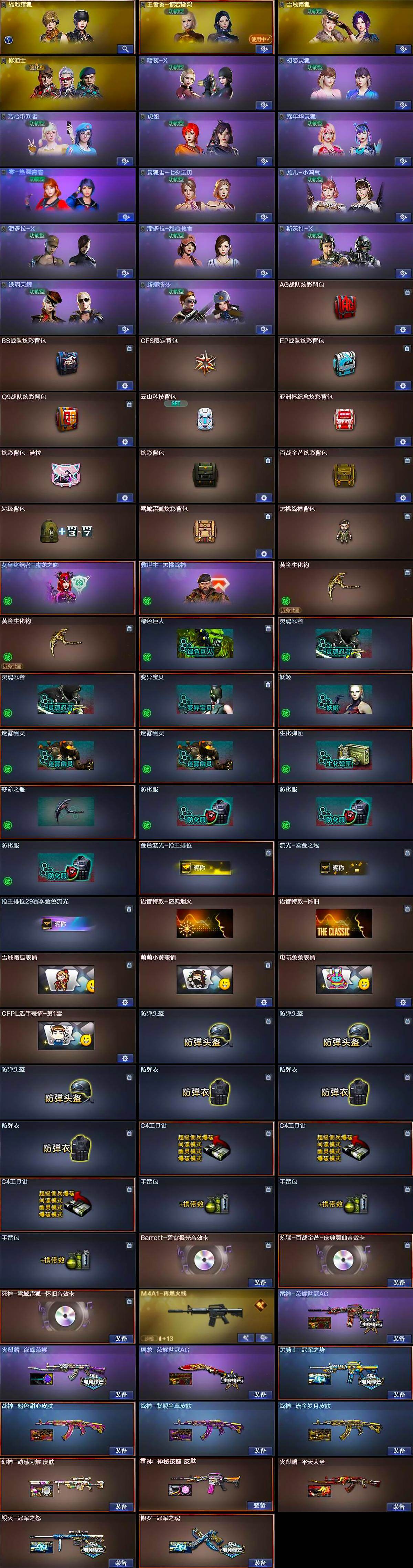 【道具】:AG战队炫彩背包,BS战队炫彩背包,CFS限定背包,EP战队炫彩背包,Q9战队炫彩背包,云山科技背包,亚洲杯纪念炫彩背包,炫彩背包-诺拉,炫彩背包,百战金芒炫彩背包,超级背包,雪域霜狐炫彩背包,黑桃战神背包,女皇终结者-魔龙之吻,救世主-黑桃战神,黄金生化钩*2,绿色巨人,灵魂忍者*2,变异宝贝,妖姬,迷雾幽灵*2,生化弹匣,夺命之镰,防化服*3,金色流光-枪王排位,流光-鎏金之域,枪王排位29