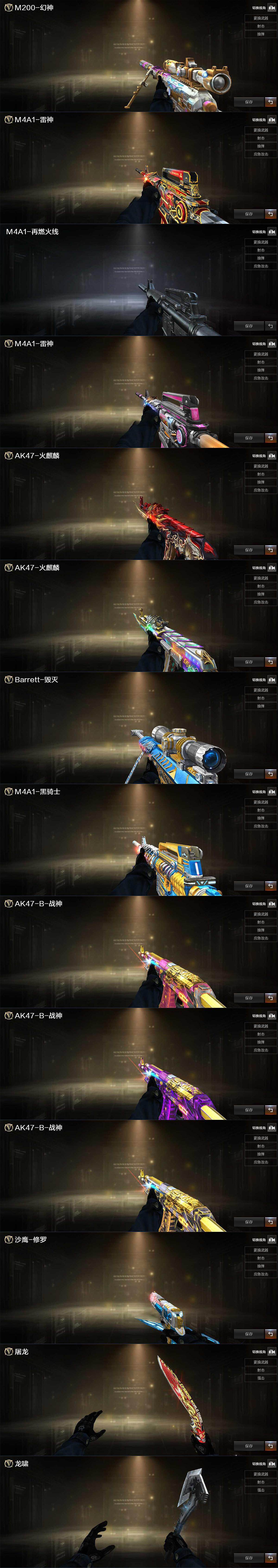 【英雄级武器】:AK47-火麒麟,M4A1-雷神,M4A1-黑骑士,M4A1-死神,无影-神兵利器,死神-雪域霜狐,SCAR Light-玄豹,AK47-B-常胜将军,白虎-电玩蓝兔,Barrett-毁灭,M200-幻神,炼狱-百战金芒,柯尔特-冠军之特,屠龙*2,龙啸,麒麟刺,荣耀世冠-龙啸,麒麟刺-百战金芒,王者之锋-觉醒版,王者之击-觉醒版,丛林匕首-玄豹,高爆手雷-玄豹,闪光弹-玄豹,烟雾弹-玄豹*2,M4A1-赤狱骑士,AWM-昌龙,Barrett-碧霄极光