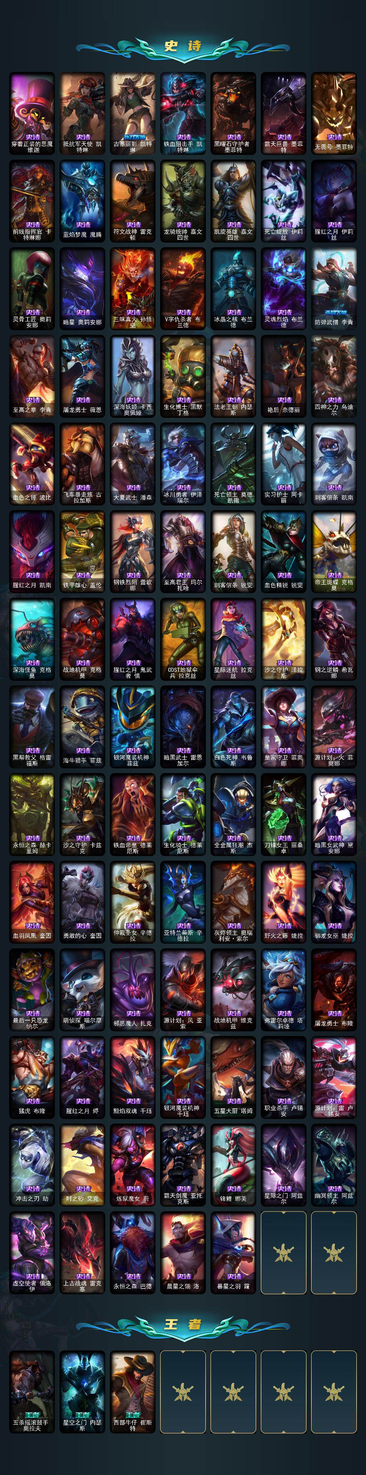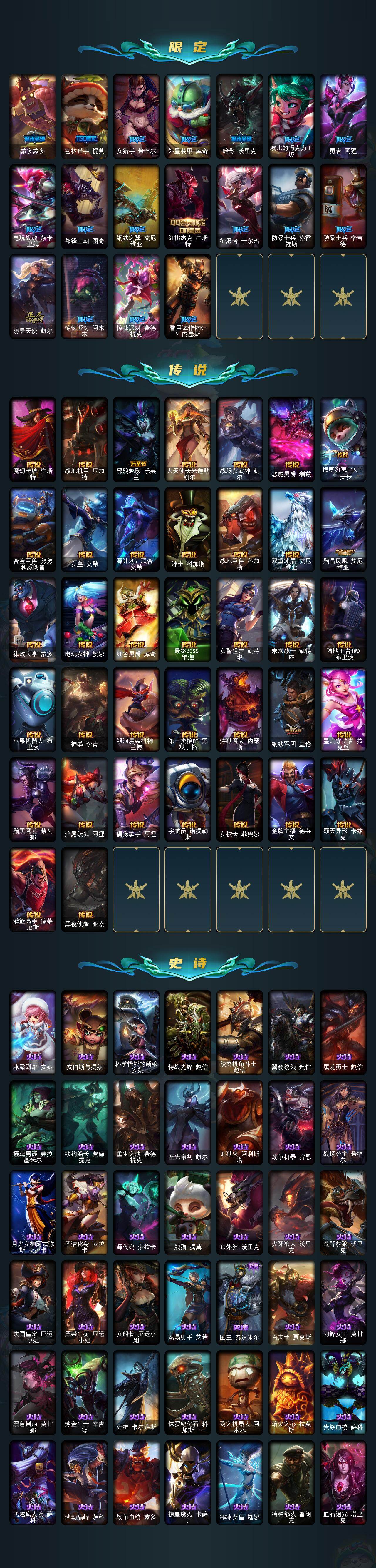 【传说皮肤】:魔幻卡牌崔斯特,战地机甲厄加特,邪鸦魅影乐芙兰,大天使长米迦勒凯尔,战场女武神凯尔,恶魔男爵瑞兹,提莫约德尔人的一大步,合金巨兽努努和威朗普,女皇艾希,源计划联合艾希,绅士科加斯,战地巨兽科加斯,双重冰晶艾尼维亚,黯晶凤凰艾尼维亚,律政大亨蒙多,电玩女神娑娜,