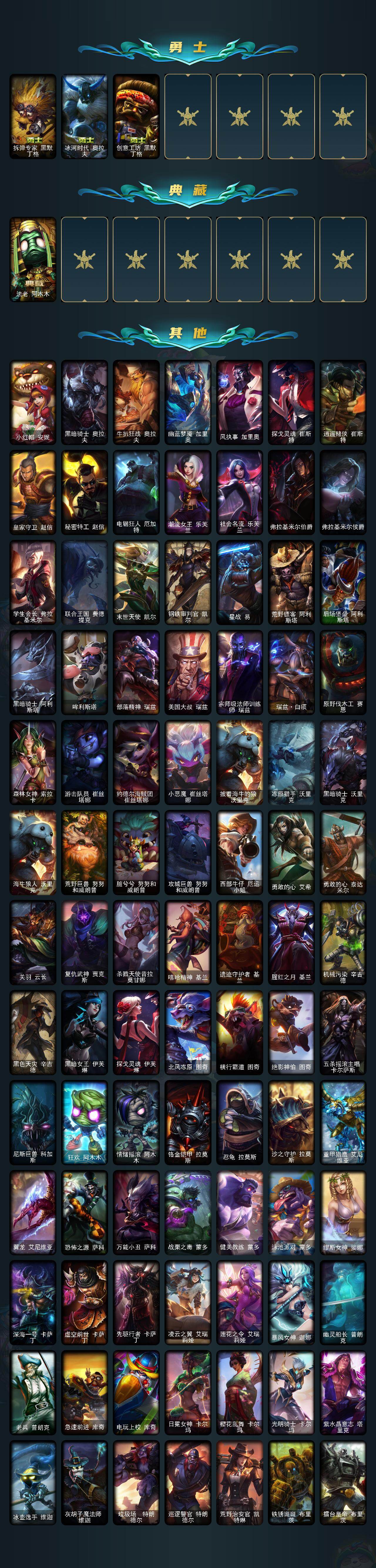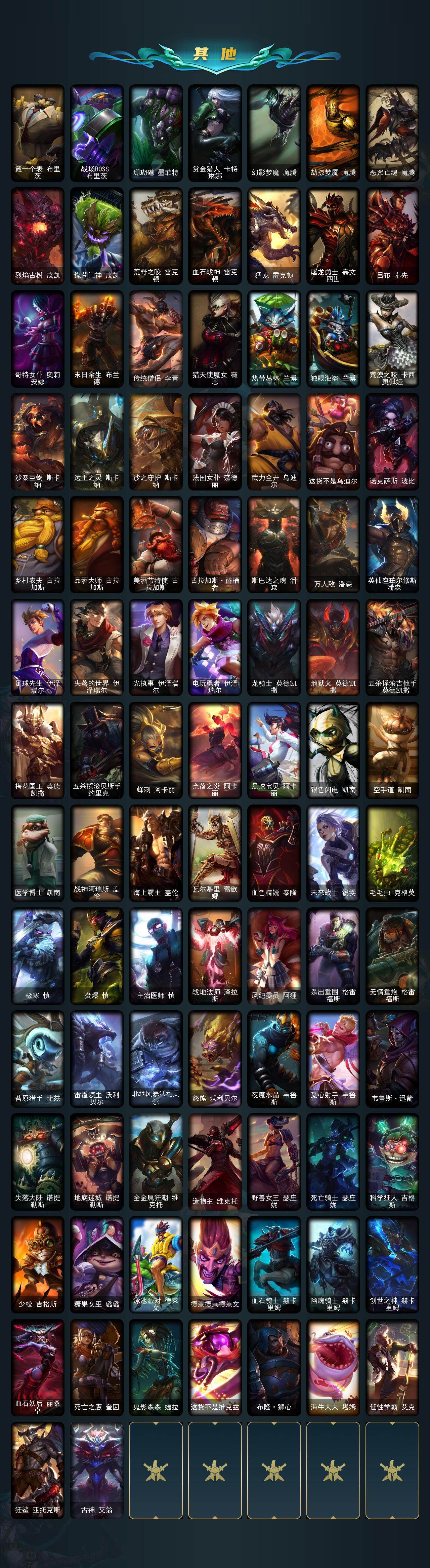【限定皮肤】:哥特萝莉安妮,钢铁军团拉克丝,诺斯费拉图弗拉基米尔,冠军典狱长锤石,冠军之血希瓦娜,冠军之矛卡莉丝塔,Fnatic古拉加斯,Fnatic卡尔萨斯,暗杀星奥莉安娜,暗杀星蒙多,暗杀星努努和威朗普,暗杀星慎,暗杀星伊泽瑞尔,SKTT1贾克斯,SKTT1劫,SSW辛吉德,SSW雷恩加尔,SKTT1阿利斯塔,SKTT1阿兹尔,SKTT1卡莉丝塔,SKTT1雷克顿,SKTT1瑞兹,SKTT1伊莉丝,勇敢的心德莱厄斯,电玩女神厄运小姐,电玩勇者锐雯,电玩女神阿狸,星之守护者伊泽瑞尔,胜利之树茂凯,胜利枪神格雷福斯,胜利女神奥莉安娜,胜利之王泰达米尔,胜利女神菲奥娜,海贼瑞兹,南瓜头费德提克,鬼影重重魔腾,鬼影森森茂凯,泳池派对格雷福斯,泳池派对雷克顿,泳池派对李青,机械迷城加里奥,蓝色忧郁崔斯特,蒙多蒙多,密林猎手提莫,女猎手希维尔,外星装甲库奇,暗影沃里克,波比的巧克力工坊,勇者阿狸,电玩战魂赫卡里姆,都铎王朝图奇,钢铁之翼艾尼维亚,红桃杰克崔斯特,征服者卡尔玛,防暴士兵格雷福斯,防暴士兵辛吉德,防暴天使凯尔,惊悚派对阿木木,惊悚派对费德提克,警用试作体K9内瑟斯