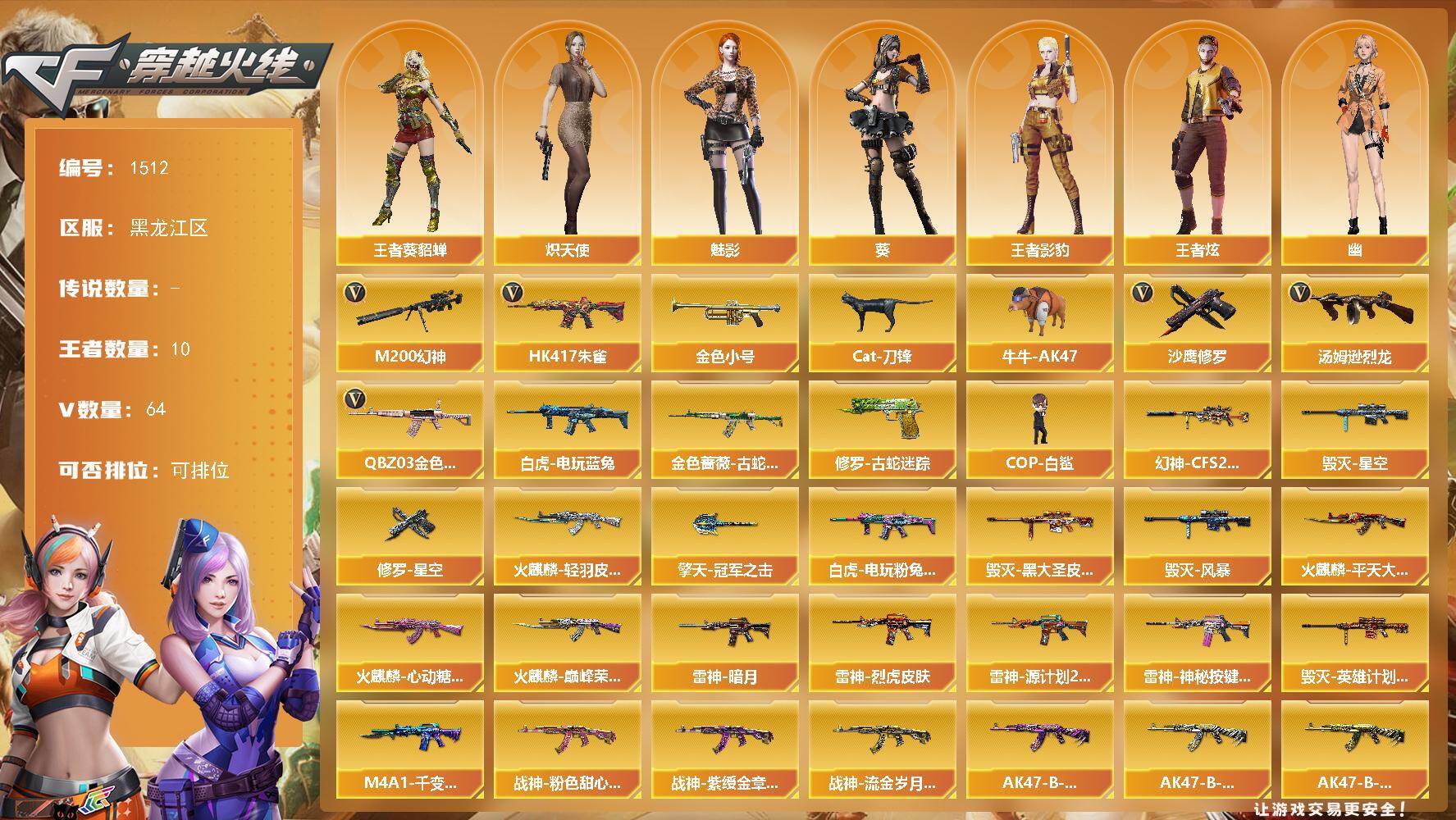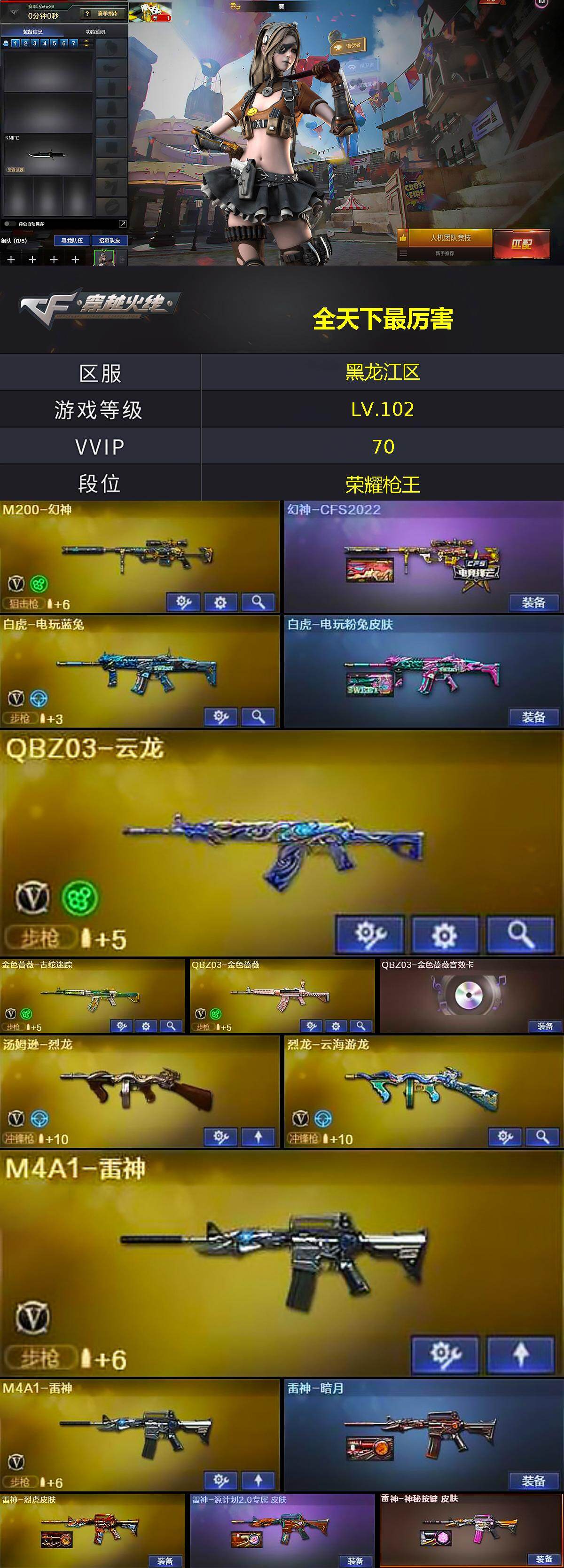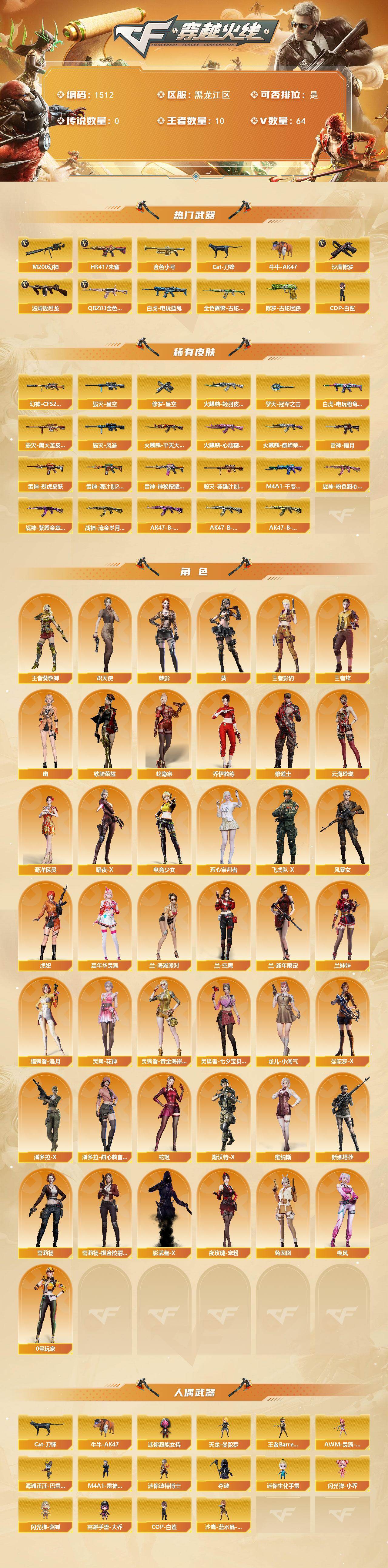 [15514522]黑龙江区-64V-10王者-0炫金 【热门武器】:QBZ03-金色蔷薇,HK417-朱雀,M200-幻神,金色蔷薇-古蛇迷踪,修罗-古蛇迷踪,白虎-电玩蓝兔,金色小号,Cat-刀锋,牛牛-AK47,汤姆逊-烈龙,COP-白鲨*2,沙鹰-修罗*3 【皮肤】:幻神-CFS2022,白虎-电玩粉兔皮肤,雷神-暗月,雷神-烈虎皮肤,雷神-源计划2.0专属 皮肤,雷神-神秘按键 皮肤,火麒麟-轻羽皮肤,