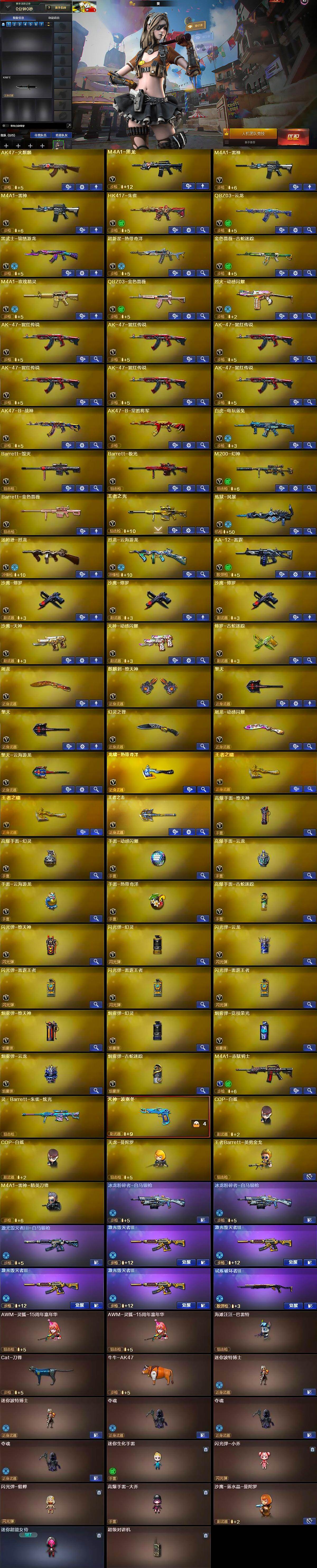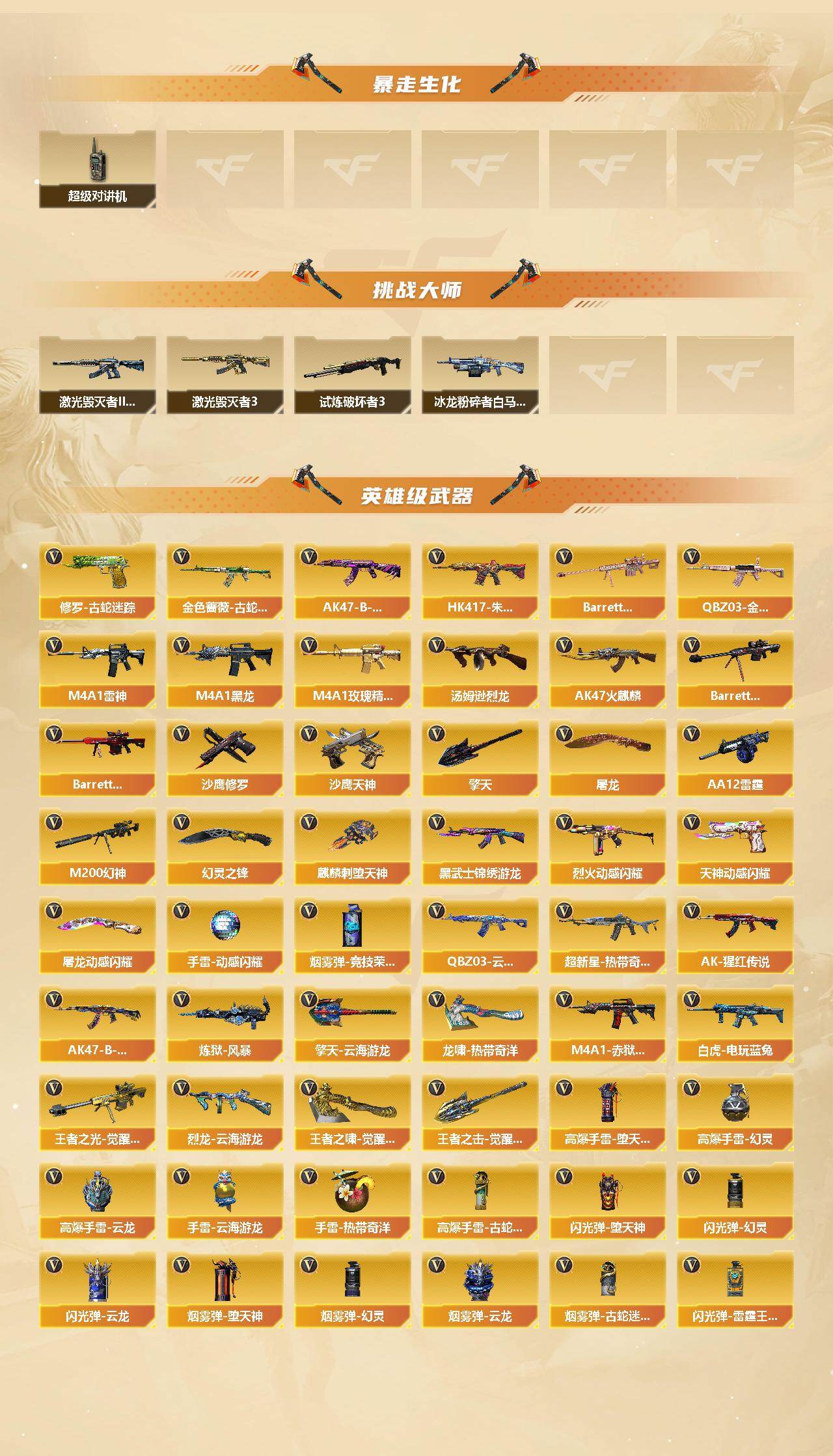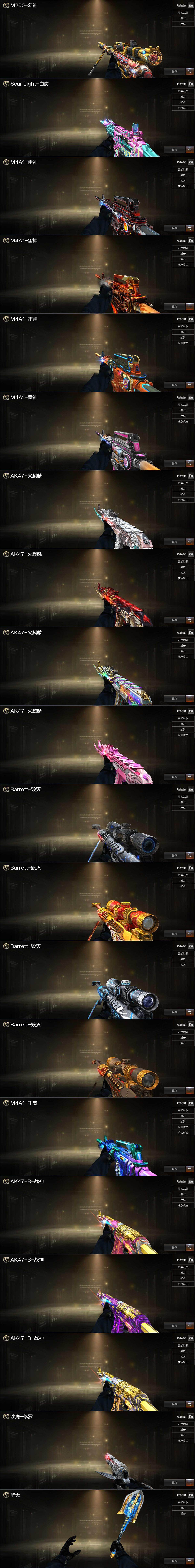 【热门武器】:QBZ03-金色蔷薇,HK417-朱雀,M200-幻神,金色蔷薇-古蛇迷踪,修罗-古蛇迷踪,白虎-电玩蓝兔,金色小号,Cat-刀锋,牛牛-AK47,汤姆逊-烈龙,COP-白鲨*2,沙鹰-修罗*3