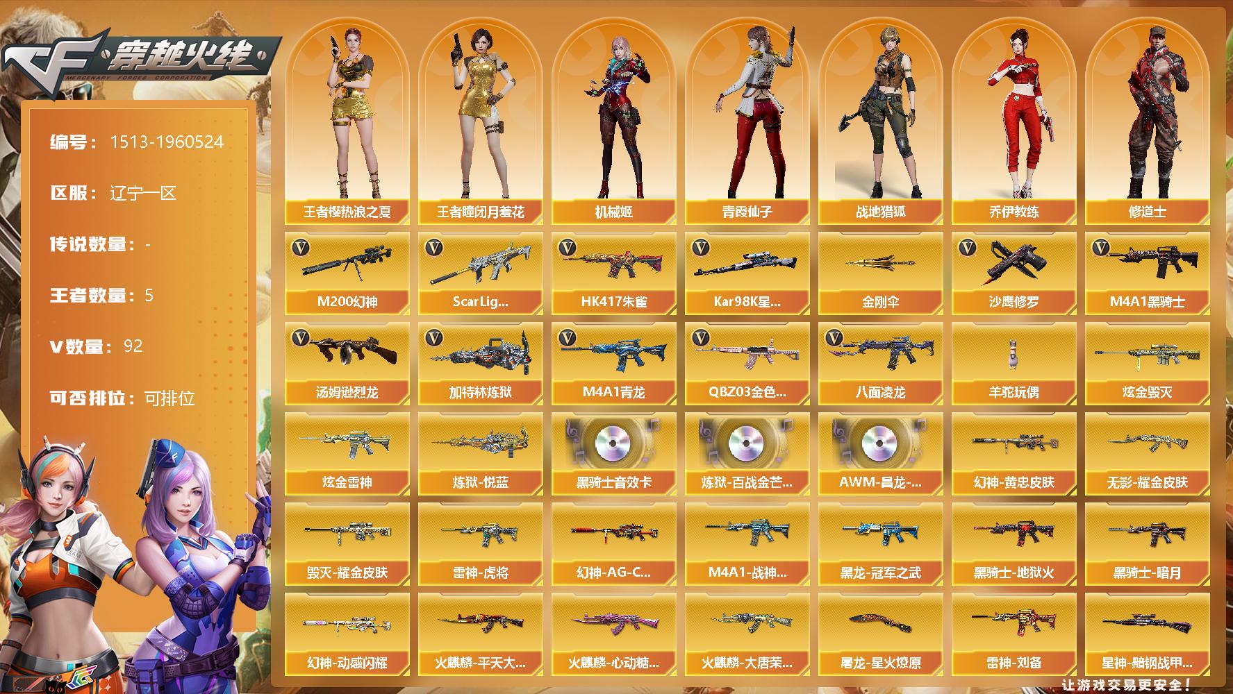 [15514707]辽宁一区-92V-5王者-2炫金 【热门武器】:QBZ03-金色蔷薇,Scar Light-白虎,HK417-朱雀,M4A1-青龙,M200-幻神,八面凌龙,Kar98K-星神,M4A1-黑骑士,汤姆逊-烈龙*2,加特林-炼狱*2,羊驼玩偶,沙鹰-修罗*2,金刚伞 【王者炫金武器】:炼狱-悦蓝,炫金雷神,炫金毁灭 【音效卡】:M4A1-黑骑士音效卡,炼狱-百战金芒-庆典舞曲音效卡,AWM-昌龙